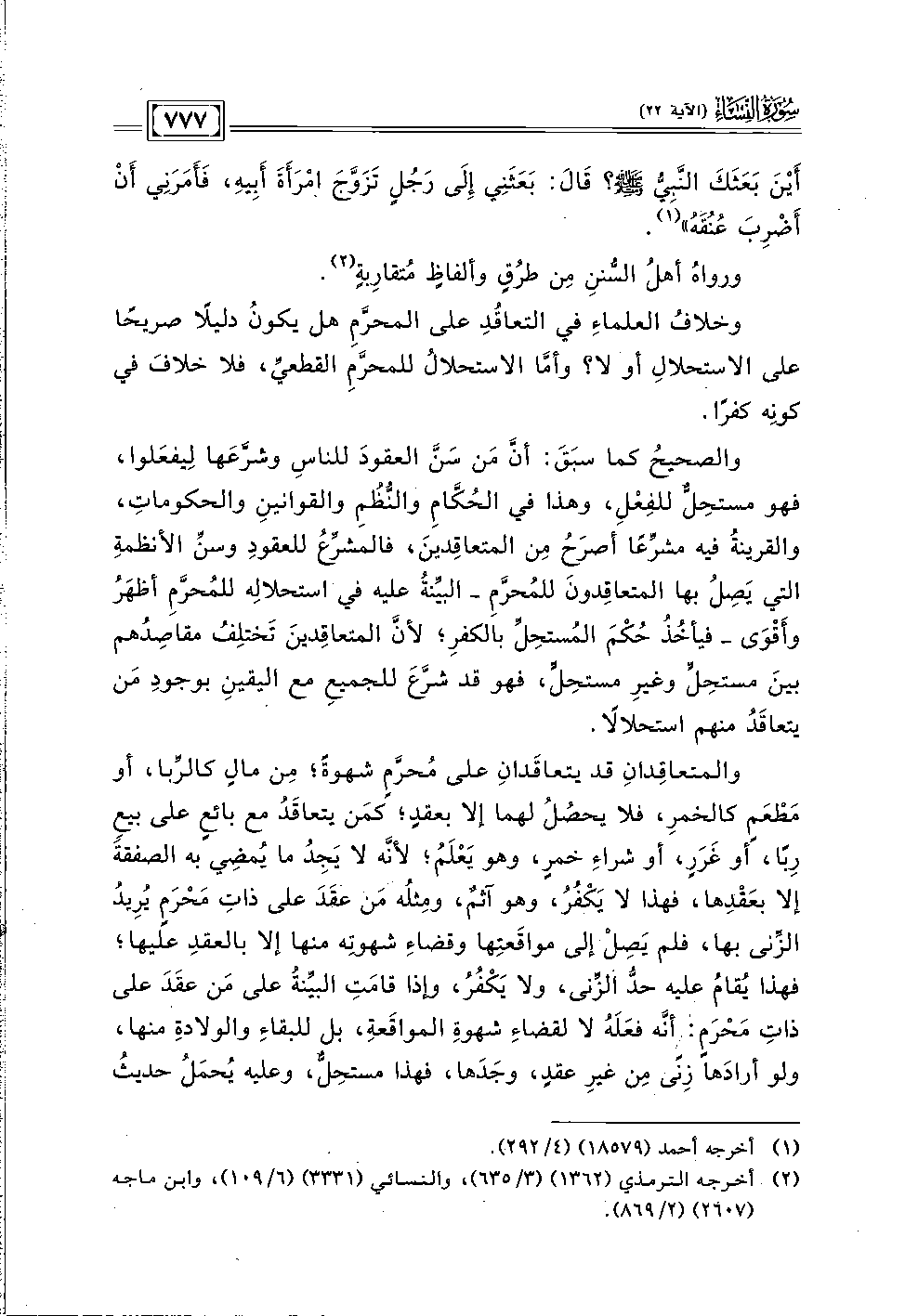 والمتعاقدان قد يتعاقدان على مُحرَّمٍ شهوةً؛ من مالٍ كالرِّبا، أو مطعمٍ كالخمرِ، فلا يحصُلُ لهما إلا بعقدٍ؛ كمن يتعاقد مع بائعٍ على بيع ربًا، أو غَرَرٍ، أو شراء خمرٍ، وهو يعلم؛ لأنَّه لا يجدُ ما يُمضي به الصفقة إلا بعقدها، فهذا لا يكفُر، وهو آثمٌ، ومثله من عقد على ذاتِ محْرمٍ يُريد الزِّنى بها، فلم يصل إلى مواقعتها وقضاء شهوته منها إلا بالعقد عليها؛ فهذا يقام عليه حدُّ الزِّنى، ولا يكفُر، وإذا قامت البيِّنةُ على من عقد على ذاتِ مَحْرَمٍ: أنَّه فعله لا لقضاءِ شهوة المواقعة، بل للبقاء والولادة منها، ولو أرادها زنًى من غير عقدٍ، وجدَها، فهذا مستحِلٌّ، وعليه يُحملُ حديث