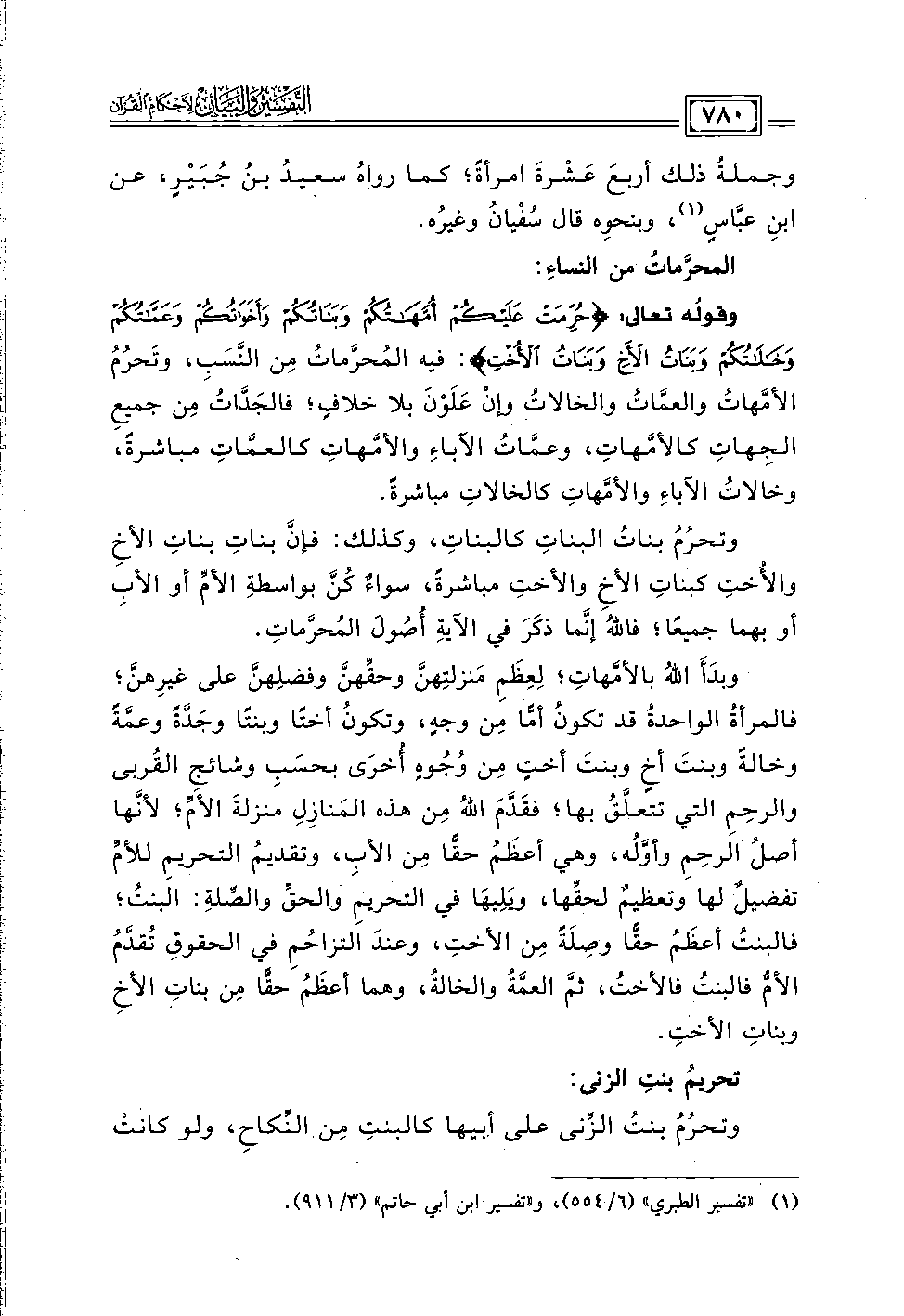 وقوله تعالى: {حُرِّمَتْ عَلَيْكُمْ أُمَّهَاتُكُمْ وَبَنَاتُكُمْ وَأَخَوَاتُكُمْ وَعَمَّاتُكُمْ وَخَالَاتُكُمْ وَبَنَاتُ الْأَخِ وَبَنَاتُ الْأُخْتِ}: فيه المُحرَّماتُ من النَّسَبِ، وتحْرُمُ الأمَّهاتُ والعمَّاتُ والخالاتُ وإن علوْن بلا خلافٍ؛ فالجَدَّاتُ من جميع الجهات كالأمَّهات، وعمَّاتُ الآباء والأمَّهات كالعمَّاتِ مباشرةً، وخالاتُ الآباء والأمَّهاتِ كالخالاتِ مباشرةً.