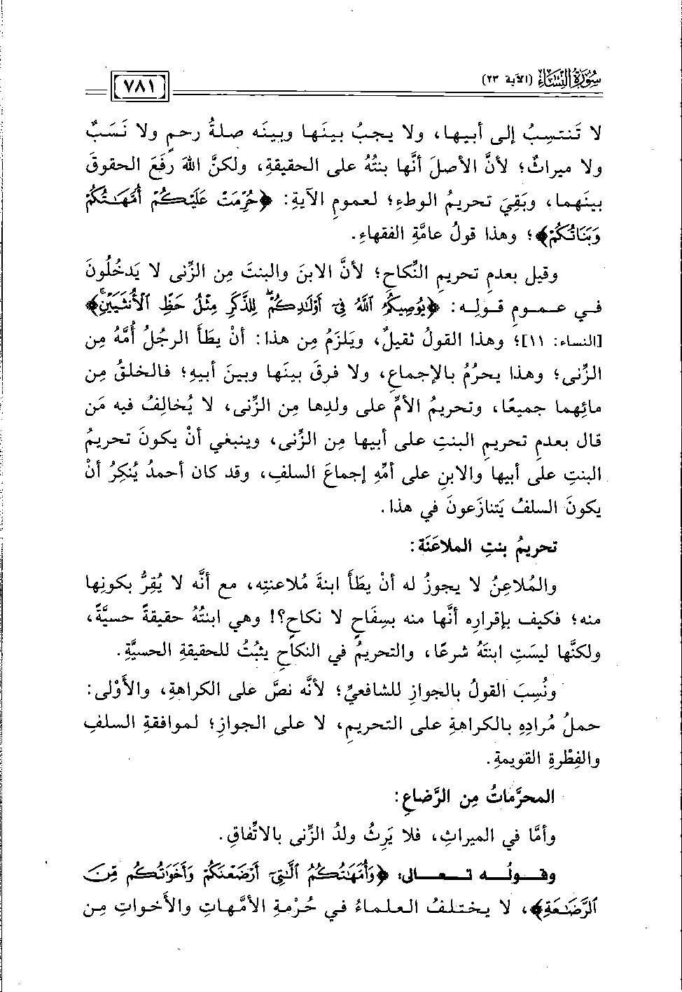 وقيل بعدم تحريم النِّكاح؛ لأنَّ الابن والبنت من الزِّنى لا يدخلون في عموم قوله: {يُوصِيكُمُ اللَّهُ فِي أَوْلَادِكُمْ لِلذَّكَرِ مِثْلُ حَظِّ الْأُنْثَيَيْنِ} [النساء: ١١]؛ وهذا القول ثقيلٌ، ويلزم من هذا: أن يطأ الرجل أمّه من الزِّنى؛ وهذا يحرُم بالإجماع، ولا فرق بينها وبين أبيه؛ فالخلق من مائهما جميعًا، وتحريم الأمِّ على ولدها من الزِّنى، لا يُخالف فيه مَن قال بعدم تحريم البنت على أبيها من الزِّنى، وينبغي أن يكون تحريم البنت على أبيها والابن على أمِّه إجماع السلف، وقد كان أحمد يُنكر أن يكون السلف يتنازعون في هذا.