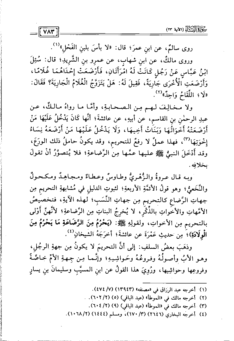 ولا مخالف لهم من الصحابة، وأمَّا ما رواه مالكٌ، عن عبد الرحمن بن القاسم، عن أبيه، عن عائشة؛ أنَّها كان يدْخل عليها مَن أرضَعَتْه أخواتُها وبناتُ أخيها، ولا يدْخُلُ عليها مَن أرضعه نِساءُ إخوتها (٣) , فهذا عملٌ لا رفعٌ للتحريم، وقد يكون حامل ذلك الورع، وقد أدخل النبيُّ - صلى الله عليه وسلم - عليها عمَّها من الرَّضاعة؛ فلا يُتصوَّر أن تقول بخلافِه.
