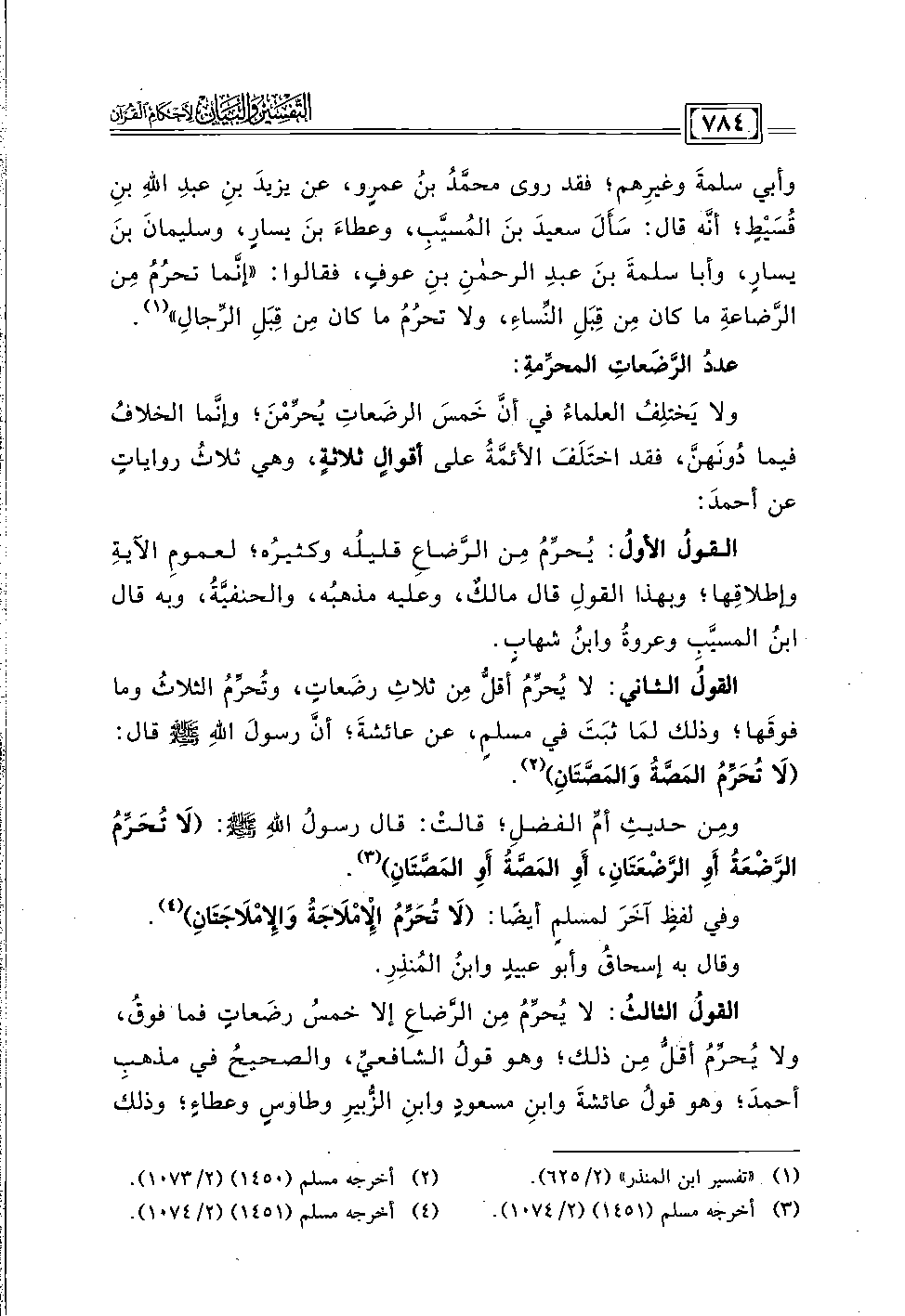 القول الثاني: لا يُحرِّم أقلُّ من ثلاث رضعاتٍ، وتُحرِّمُ الثلاث وما فوقها؛ وذلك لما ثبت في مسلمٍ، عن عائشة؛ أنَّ رسول الله - صلى الله عليه وسلم - قال: (لا تُحَرِّمُ المصَّةُ والمصَّتانِ) (٢).