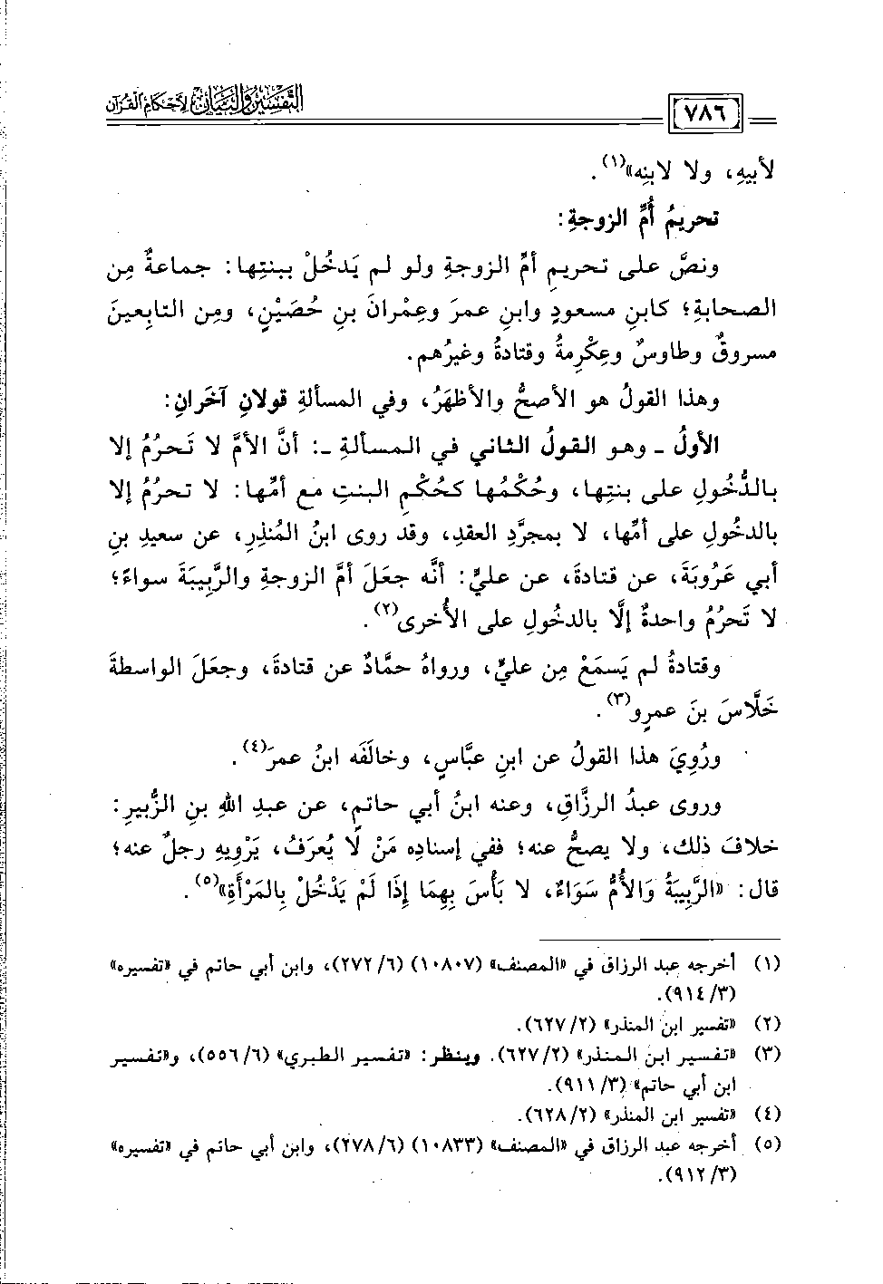 الأول - وهو القول الثاني في المسألة -: أنَّ الأمَّ لا تحرُمُ إلا بالدُّخُول على بنتها، وحُكْمُها كحُكْم البنت مع أُمِّها: لا تحرُمُ إلا بالدخُولِ على أمِّها، لا بمجرَّد العقد، وقد روى ابن المُنذر، عن سعيد بن أبي عَرُوبة، عن قتادةَ، عن عليٍّ: أنَّه جعل أمَّ الزوجة والرَّبيبةَ سواءً؛ لا تحرُمُ واحدةٌ إلَّا بالدخول على الأخرى (٢).
