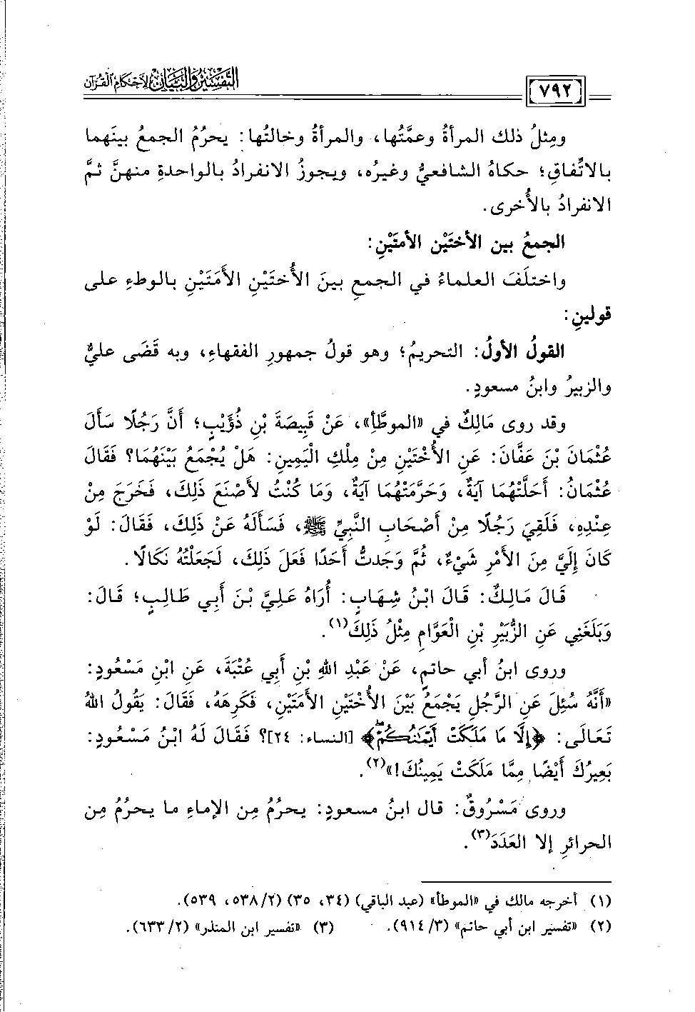 وروى ابن أبي حاتمٍ، عن عبد الله بن أبي عُتْبَة، عن ابن مسْعُودٍ: "أنَّهُ سُئِلَ عن الرَّجُلِ يجمع بين الأختين الأمَتَين، فكرهه، فقال: يقول اللهُ تعالى: {إِلَّا مَا مَلَكَتْ أَيْمَانُكُمْ} [النساء: ٢٤]؟ فقال له ابن مسْعُودٍ: بعيرُكَ أيضًا ممَّا ملكت يمينُك! " (٢).