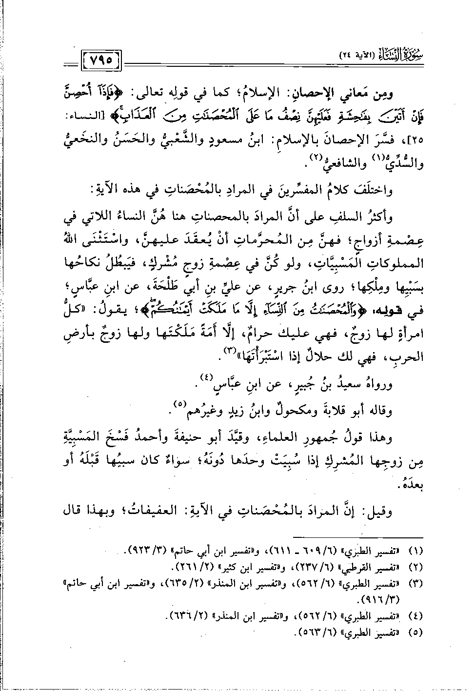 وأكثر السلف على أنَّ المراد بالمحصنات هنا هُنَّ النساء اللاتي في عِصْمة أزواجٍ؛ فهنَّ من المُحرَّمات أن يُعقَد عليهنَّ، واسْتثنى الله المملوكاتِ المسْبيَّات، ولو كُنَّ في عِصْمة زوجٍ مُشركٍ، فيبطل نكاحُها بسَبْيِها ومِلْكِها؛ روي ابن جريرٍ، عن عليِّ بن أبي طلحَة، عن ابن عبَّاسٍ، في قولِه: {وَالْمُحْصَنَاتُ مِنَ النِّسَاءِ إِلَّا مَا مَلَكَتْ أَيْمَانُكُمْ}؛ يقول: "كلُّ امرأةٍ لها زوجٌ، فهي عليك حرامٌ، إلَّا أمةً ملَكْتها ولها زوجٌ بأرضِ الحربِ، فهي لك حلالٌ إذا اسْتبرأتها" (٣).