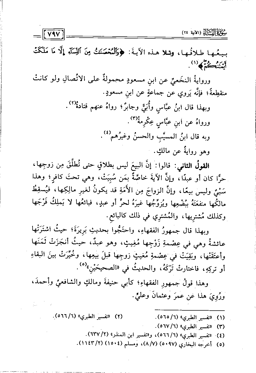 بيعُها طلاقُها، وتلا هذه الآيةَ: {وَالْمُحْصَنَاتُ مِنَ النِّسَاءِ إِلَّا مَا مَلَكَتْ أَيْمَانُكُمْ} (١).