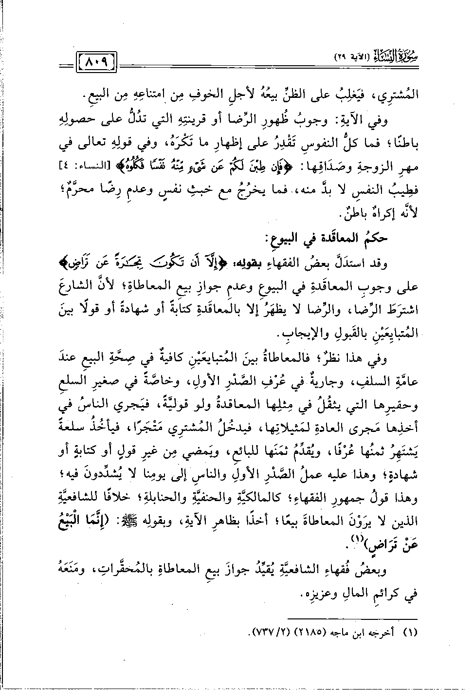 وفي هذا نظرٌ؛ فالمعاطاةُ بينَ المُتبايعَيْنِ كافيةٌ في صِحَّةِ البيعِ عندَ عامَّةِ السلف، وجاريةٌ في عُرْفِ الصَّدْرِ الأول، وخاصَّةً في صغيرِ السلعِ وحقيرِها الني يثقُلُ في مِثلِها المعاقدةُ ولو قوليَّةً، فيَجري الناسُ في أخذِها مَجرى العادةِ لمَثيلاتِها، فيدخُلُ المُشترِي مَتْجَرًا، فيأخُدُ سلعةً يَشتَهِرُ ثمنُها عُرْفًا، ويُقدِّمُ ثمَنَها للبائع، ويَمضي مِن غيرِ قولٍ أو كتابةٍ أو شهادةٍ؛ وهذا عليه عملُ الصَّدْرِ الأولِ والناسِ إلى يومِنا لا يُشدِّدونَ فيه؛ وهذا قولُ جمهورِ الفقهاءِ؛ كالمالكيَّةِ والحنفيَّةِ والحنابلةِ؛ خلافًا للشافعيَّةِ الذين لا يرَوْنَ المعاطاةَ بيعًا؛ أخذًا بظاهرِ الآية، وبقولِه - صلى الله عليه وسلم -: (إِنَّمَا الْبَيْعُ عَنْ تَرَاضٍ) (١).