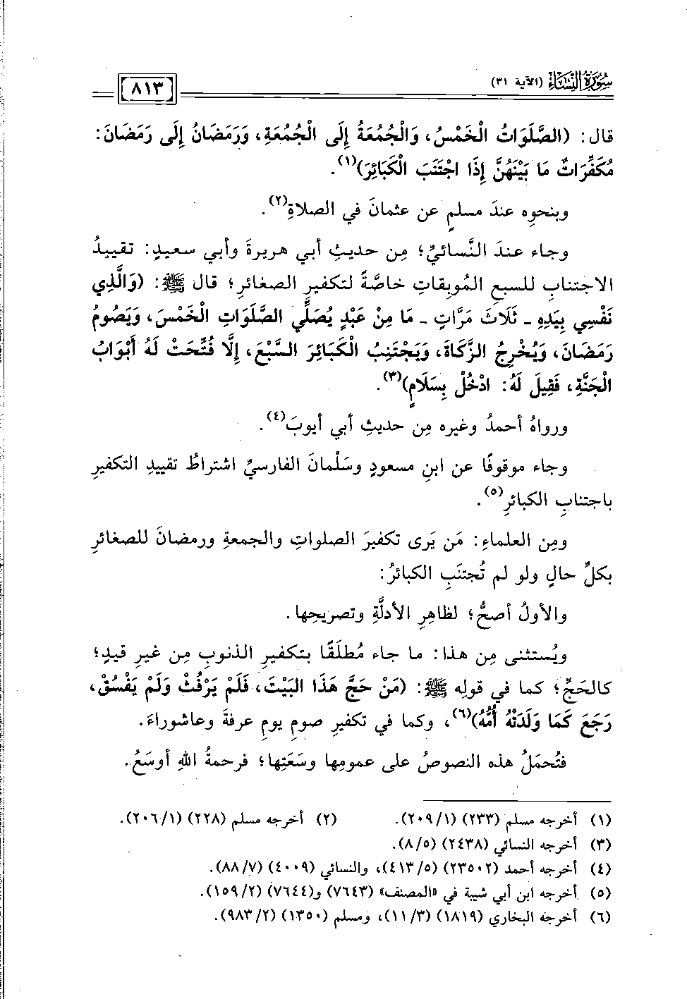 وجاء عندَ النَّسائيِّ، مِن حديثِ أبي هريرةَ وأبي سعيدٍ: تقييدُ الاجتنابِ للسبعِ المُوبِقاتِ حاصَّةً لتكفيرِ الصغائرِ؛ قال - صلى الله عليه وسلم -: (وَالَّذِي نَفْسِي بِيَدِهِ - ثَلَاثَ مَرَّاتٍ - مَا مِنْ عَبْدٍ يُصَلِّي الصَّلَوَاتِ الْخَمْسَ، وَيَصُومُ رَمَضَانَ، ويُخْرِجُ الزَّكَاةَ، وَيَجْتَنِبُ الْكَبَائِرَ السَّبْعَ، إِلَّا فُتِّحَتْ لَهُ أَبْوَابُ الْجَنَّةِ, فَقِيلَ لَهُ: ادْخُلْ بِسَلَامٍ) (٣).