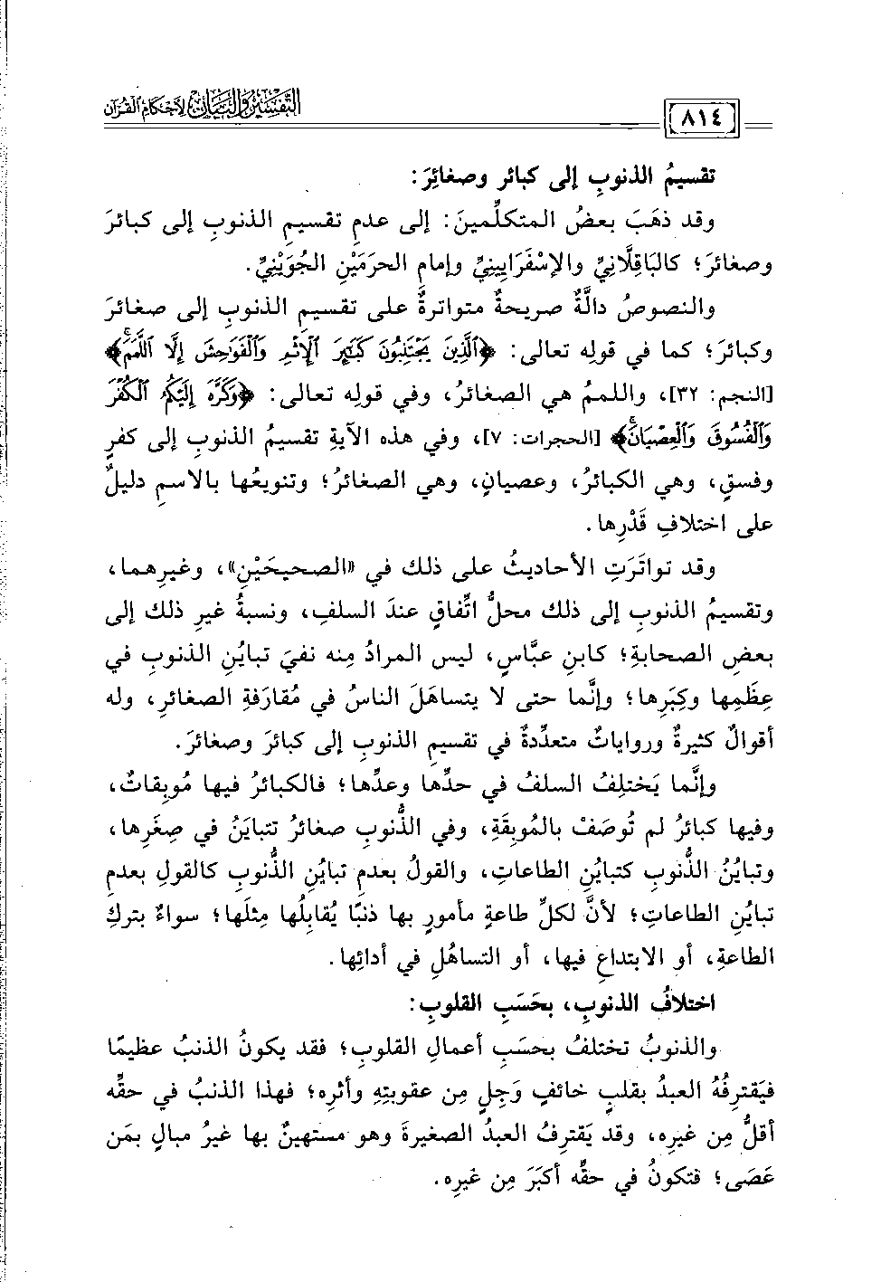 والنصوصُ دالَّةٌ صريحةٌ متواترةٌ على تقسيمِ الذنوبِ إلى صغائرَ وكبائرَ؛ كما في قوله تعالى: {الَّذِينَ يَجْتَنِبُونَ كَبَائِرَ الْإِثْمِ وَالْفَوَاحِشَ إِلَّا اللَّمَمَ} [النجم: ٣٢]، واللممُ هي الصغائرُ، وفي قولِه تعالى: {وَكَرَّهَ إِلَيْكُمُ الْكُفْرَ وَالْفُسُوقَ وَالْعِصْيَانَ} [الحجرات: ٧]، وفي هذه الآيةِ تقسيمُ الذنوبِ إلى كفرٍ وفسقٍ، وهي الكبائرُ، وعصيانٍ، وهي الصغائرُ؛ وتنويعُها بالاسمِ دليلٌ على اختلافِ قَدْرِها.