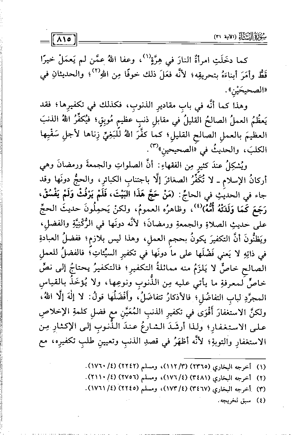 ويُشكِلُ عندَ كثيرٍ مِن الفقهاءِ: أنَّ الصلواتِ والجمعةَ ورمضانَ وهي أركانُ الإسلامِ - لا تُكَفِّرُ الصغائرَ إلَّا باجتناب الكبائر، والحجُّ دونَها وقد جاء في الحديثِ في الحاجِّ: (مَنْ حَجَّ هَذَا البَيْتَ، فَلَمْ يَرْفُثْ وَلَمْ يَفْسُقْ، رَجَعَ كَمَا وَلَدَتْهُ أُمُّهُ) (٤)، وظاهرُه العمومُ، ولكنْ يَحمِلُونَ حديثَ الحجِّ على حديثِ الصلاةِ والجمعةِ ورمضانَ؛ لأنِّه دونَها في الرُّكْنِيَّةِ والفضل، ويَظنُّونَ أنَّ التكفيرَ يكونُ بحجمِ العمل، وهذا ليس بلازمٍ؛ ففضلُ العبادةِ في ذاتِهِ لا يَعني فَضْلَها على ما دونَها في تكفيرِ السيِّئاتِ؛ فالفضلُ للعملِ الصالحِ خاصٌّ لا يَلزَمُ منه مماثلةُ التكفيرِ؛ فالتكفيرُ يحتاجُ إلى نصِّ خاصٍّ لمعرفةِ ما يأتي عليه مِن الذُّنوبِ ونوعِها، ولا يُؤخَذُ بالقياسِ المجرَّدِ لبابِ التفاضُلِ؛ فالأذكارُ تتفاضَلُ، وأفْضَلُها قولُ: لا إلهَ إلَّا اللهُ، ولكنَّ الاستغفارَ أَقْوَى في تكفيرِ الذنبِ المُعَيَّنِ مع فضلِ كلمةِ الإخلاصِ على الاستغفارِ؛ ولذا أرشَدَ الشارعُ عندَ الذُّنوبِ إلى الإكثارِ مِن الاستغفارِ والتوبة؛ ، لأنَّه أظهَرُ في قصدِ الذنبِ وتعيينِ طلبِ تكفيرِه، مع
