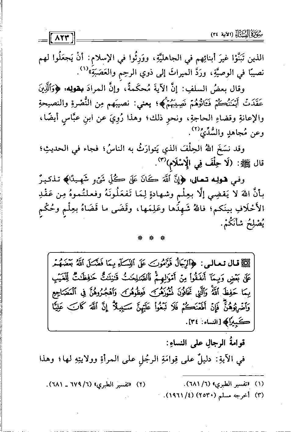 وقال بعضُ السلفِ: إنَّ الآيةَ مُحكَمةٌ، وإنَّ المرادَ بقولِه، {وَالَّذِينَ عَقَدَتْ أَيْمَانُكُمْ فَآتُوهُمْ نَصِيبَهُمْ}؛ يعني: نصيبَهم مِن النُّصْرةِ والنصيحةِ والإعانةِ وقضاءِ الحاجة، ونحوِ ذلك؛ وهذا رُوِيَ عن ابنِ عبَّاسٍ أيضًا، وعن مُجاهدٍ والسُّدِّيِّ (٢).