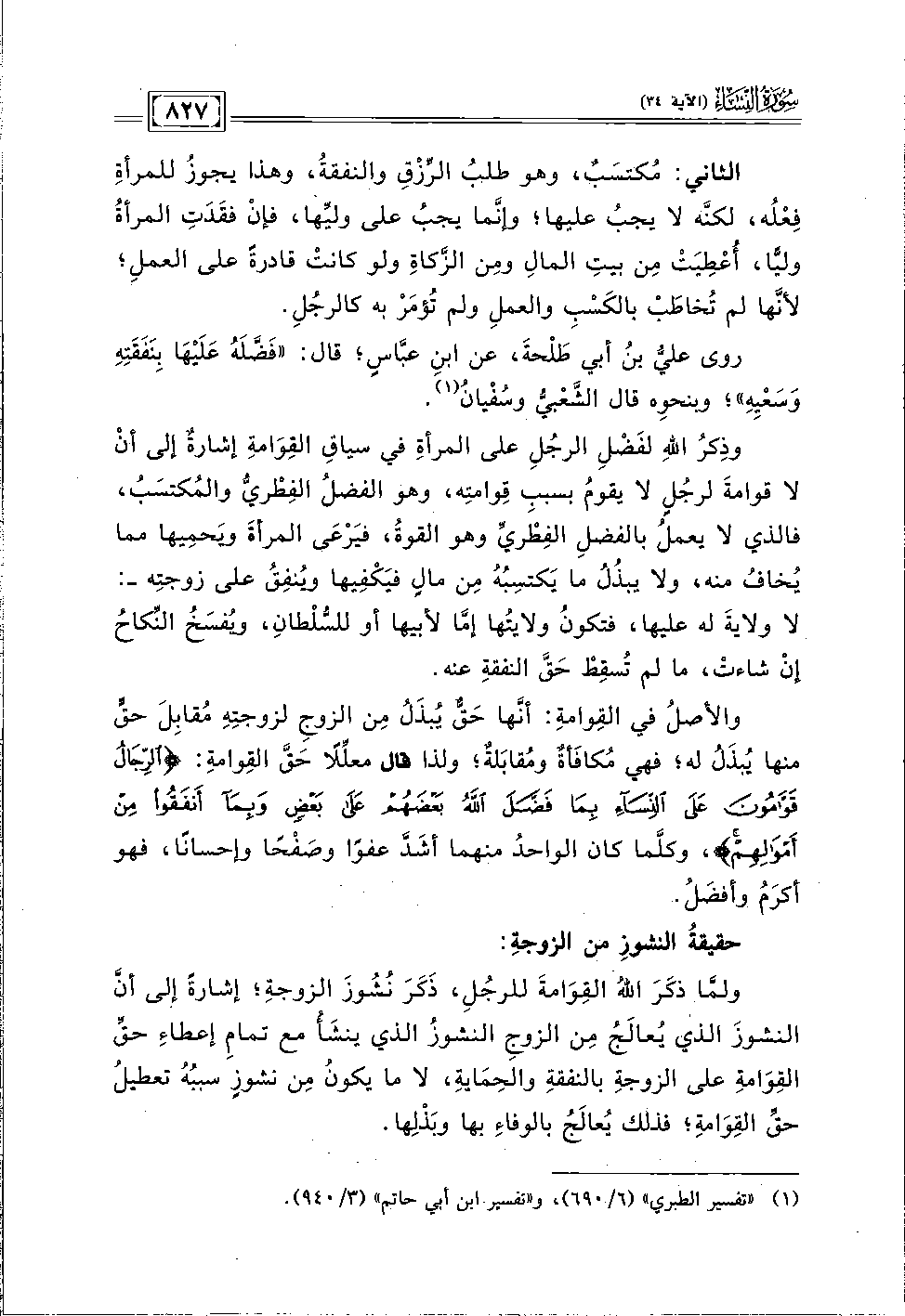 روى عليُّ بنُ أبي طَلْحةَ، عن ابنِ عبَّاسٍ؛ قال "فَضَّلَهُ عَلَيْهَا بِنَفَقَتِهِ وَسَعْيِهِ"؛ وبنحوِه قال الشَّعْبيُّ وسُفْيانُ (١).