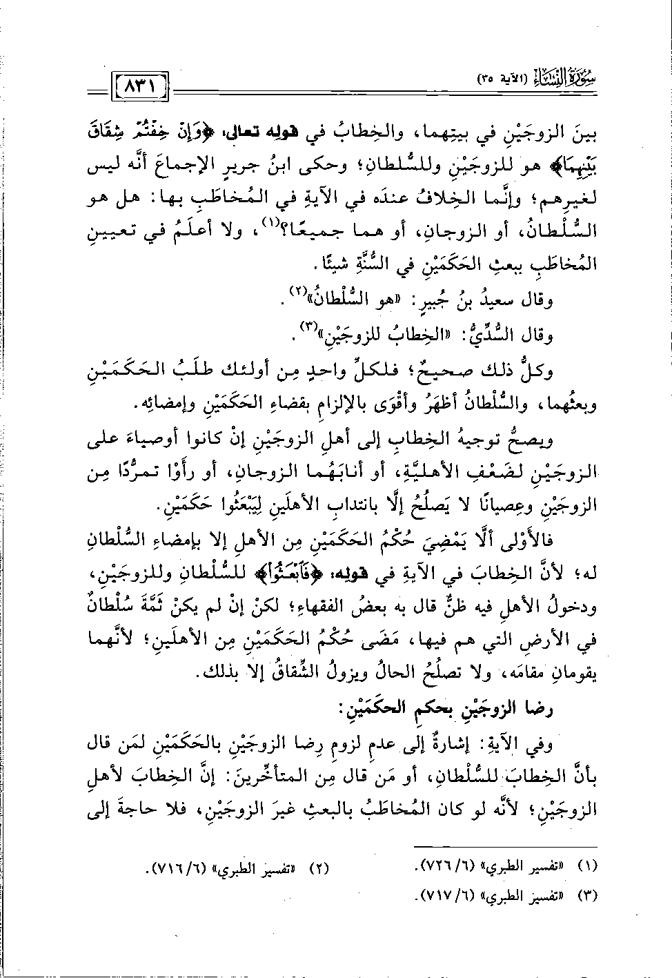 فالأوْلى ألَّا يَمْضِيَ حُكْمُ الحَكَمَيْنِ مِن الأهلِ إلا بإمضاءِ السُّلْطانِ له؛ لأنَّ الخِطابَ في الآيةِ في قولِه: {فَابْعَثُوا} للسُّلْطانِ وللزوجَيْن، ودخولُ الأهلِ فيه ظنٌّ قال به بعضُ الفقهاءِ؛ لكنْ إنْ لم يكنْ ثَمَّةَ سُلْطانٌ في الأرضِ التي هم فيها، مَضَى حُكْمُ الحَكمَيْنِ مِن الأهلَينِ؛ لأنَّهما يقومانِ مقامَه، ولا تصلُحُ الحالُ ويزولُ الشِّقاقُ إلا بذلك.