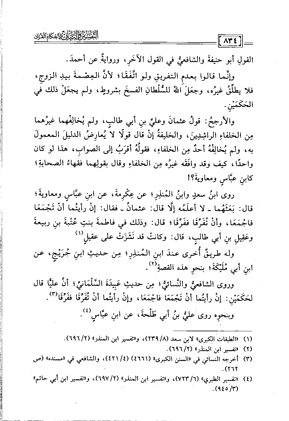 وروى الشافعيُّ والنسائيُّ؛ مِن حديثِ عَبيدَةَ السَّلْمَانيِّ؛ أنَّ عليًّا قال لحَكَمَيْنِ: إنْ رأيتُما أنْ تَجْمَعَا فاجْمَعَا، وإن رأَيتُما أنْ تُفَرِّقَا ففَرِّقَا (٣).