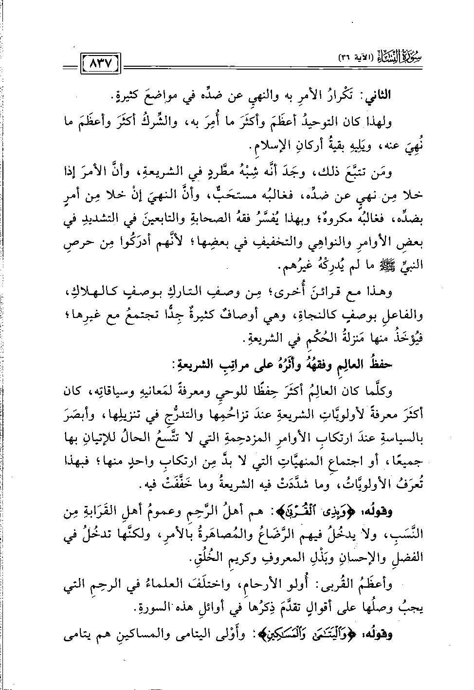 وقولُه: {وَبِذِي الْقُرْبَى}: هم أهلُ الرَّحِمِ وعمومُ أهلِ القَرَابةِ مِن النَّسَب، ولا يدخُلُ فيهم الرَّضَاعُ والمُصاهَرةُ بالأمر، ولكنَّها تدخُلُ في الفضلِ والإحسانِ وبَذْلِ المعروفِ وكريم الخُلُقِ.