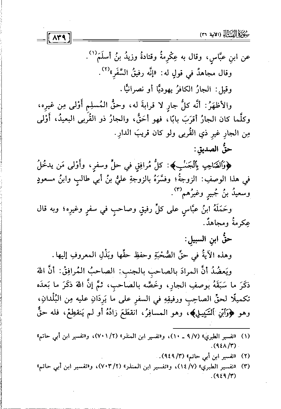 وَيعضُدُ أن المرادَ بالصاحبِ بالجنبِ: الصاحبُ المُرافِقُ: أنَّ اللهَ ذكَرَ ما سَبَقَهُ بوصفِ الجار، وخَصَّه بالصاحب، ثمَّ إنَّ اللهَ ذكَرَ ما بَعدَه تكميلًا لحقِّ الصاحِبِ ورفيقِهِ في السفرِ على ما يَرِدانِ عليه مِن البُلْدان، وهو {وَابْنِ السَّبِيلِ}، وهو المسافِرُ، انقطَعَ زادُهُ أو لم يَنقطِعْ، فله حقٌّ