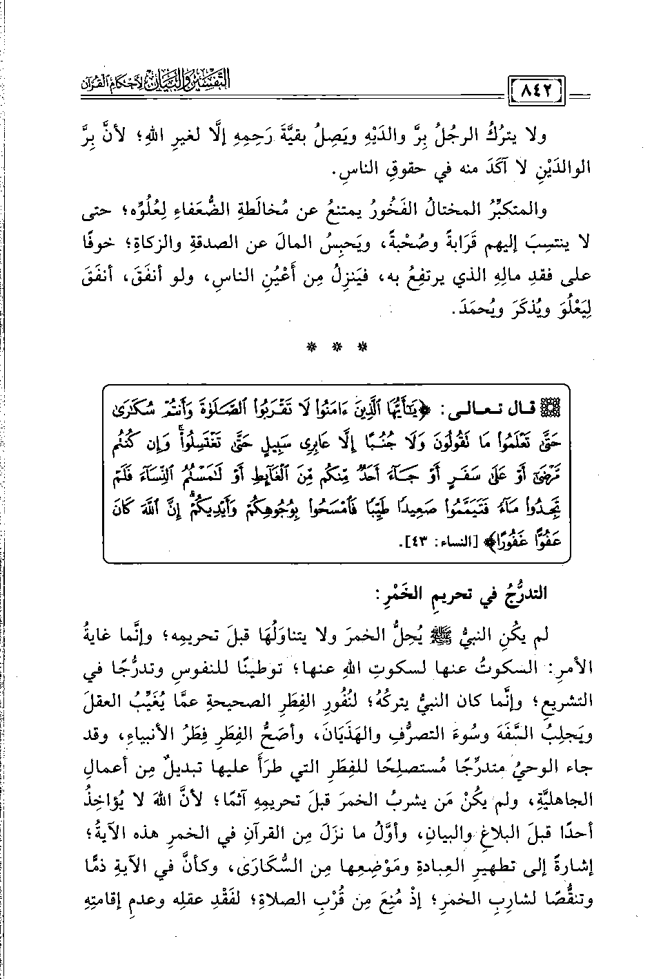 لم يكُنِ النبيُّ - صلى الله عليه وسلم - يُحِلُّ الخمرَ ولا يتناوَلُهَا قبلَ تحريمِه؛ وإنَّما غايةُ الأمرِ: السكوتُ عنها لسكوتِ اللهِ عنها؛ توطينًا للنفوسِ وتدرُّجًا في التشريعِ؛ وإنَّما كان النبيُّ يتركُهُ؛ لنُفُورِ الفِطَرِ الصحيحةِ عمَّا يُغَيِّبُ العقلَ وَيَجلِبُ السَّفَهَ وسُوءَ التصرُّفِ والهَذَيَانَ، وأصَحُّ الفِطَرِ فِطَرُ الأنبياء، وقد جاء الوحيُ متدرِّجًا مُستصلِحًا للفِطَرِ التي طرَأَ عليها تبديلٌ مِن أعمالِ الجاهليَّة، ولم يكُنْ مَن يشربُ الخمرَ قبلَ تحريمِهِ آثمًا؛ لأنَّ اللهَ لا يُؤاخِذُ أحدًا قبل البلاغِ والبيان، وأوَّلُ ما نزَلَ مِن القرآنِ في الخمرِ هذه الآيةُ؛ إشارةً إلى تطهيرِ العِبادةِ ومَوضِعِها مِن السُّكَارَى، وكأنَّ في الآية ذمًّا وتنقُّصًا لشارِب الخمرِ؛ إذ مُنِعَ مِن قُرْبِ الصلاةِ؛ لفَقْدِ عقلِه وعدمِ إقامتِهِ