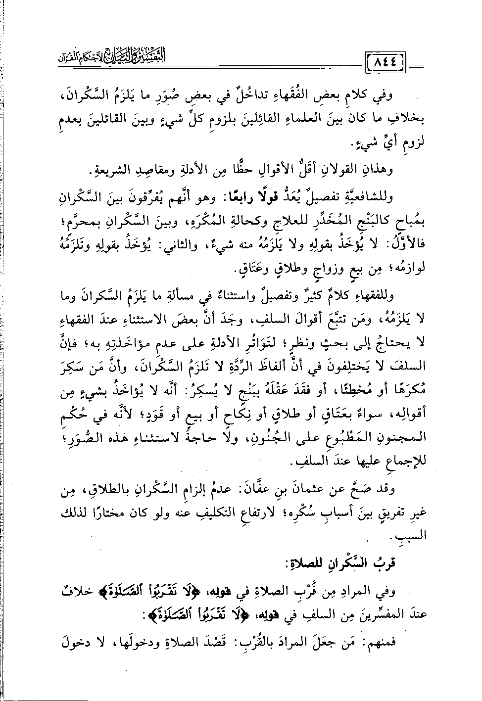 وللفقهاءِ كلامٌ كثيرٌ وتفصيلٌ واستثناءٌ في مسألةِ ما يَلزَمُ السَّكرانَ وما لا يَلزَمُهُ، ومَن تتبَّعَ أقوالَ السلفِ، وجَدَ أنَّ بعضَ الاستثناءِ عندَ الفقهاءِ لا يحتاجُ إلى بحثٍ ونظرِ؛ لتَوَاتُرِ الأدلةِ على عدمِ مؤاخَذتِهِ به؛ فإنَّ السلفَ لا يَختلِفونَ في أنَّ ألفاظَ الرِّدَّةِ لا تَلزَمُ السَّكْران، وأنَّ مَن سَكِرَ مُكرَهًا أو مُخطِئًا، أو فقَدَ عَقْلَهُ ببَنْجٍ لا يُسكِرُ: أنَّه لا يُؤاخَذُ بشيءٍ مِن أقوالِه، سواءٌ بعَتَاقٍ أو طلاقٍ أو نِكاحٍ أو بيعٍ أو قَوَدٍ؛ لأنَّه في حُكْمِ المجنونِ المَطْبُوعِ على الجُنُونِ، ولا حاجةَ لاستثناءِ هذه الصُّوَرِ؛ للإجماعِ عليها عندَ السلفِ.