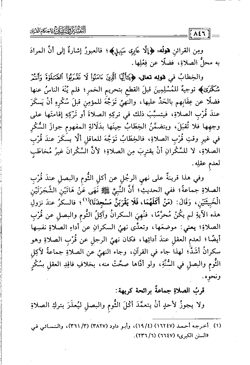 وفي هذا قرينةٌ على نهي الرجُلِ عن أكلِ الثُّومِ والبصلِ عندَ قُرْبِ الصلاةِ جماعةً؛ ففي الحديثِ؛ أَنَّ النَّبيَّ - صلى الله عليه وسلم - نَهَى عَنْ هَاتَيْنِ الشَّجَرَتَيْنِ الْخَبِيثَتَيْن، وَقَالَ: (مَن أَكَلَهُمَا، فَلَا يَقْرَبَنَّ مَسْجِدَنَا) (١)؛ فالسكرُ عندَ نزولِ هذه الآيةِ لم يكُنْ مُحرَّمًا، فنُهِيَ السكرانُ وآكِلُ الثُّومِ والبصلِ عن قُرْبِ الصلاةِ؛ يعني: موضعَها، وتعدَّى نهيُ السكرانِ عن أداءِ الصلاةِ نفسِها أيضًا؛ لعدم العقلِ عندَ أدائِها، فكان نهيُ الرجلِ عن قُرْبِ الصلاةِ وهو سكرانُ أشَدَّ؛ لهذا جاء في القرآن، وجاء النهيُ عن الصلاةِ جماعةً لآكِلِ الثُّومِ والبصلِ في السُّنَّة، ولو أدَّاها صحَّتْ منه، بخلافِ فاقِدِ العقلِ بسُكْرٍ ونحوِه.