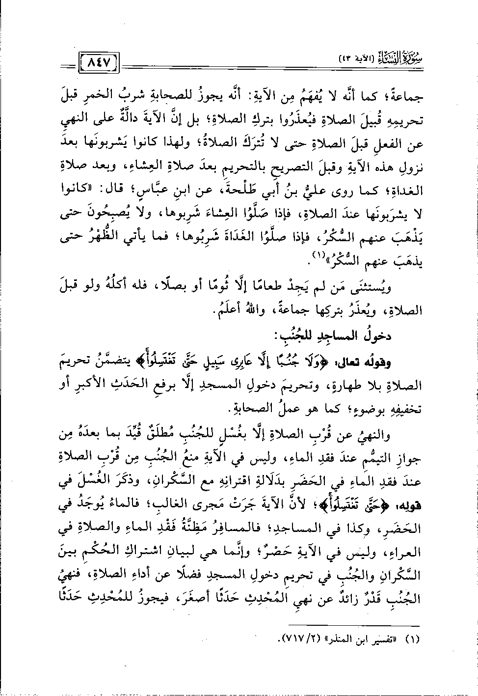 وقولُه تعالى: {وَلَا جُنُبًا إِلَّا عَابِرِي سَبِيلٍ حَتَّى تَغْتَسِلُوا} يتضمَّنُ تحريمَ الصلاةِ بلا طهارةٍ، وتحريمَ دخولِ المسجدِ إلَّا برفعِ الحَدَثِ الأكبرِ أو تخفيفِهِ بوضوءٍ؛ كما هو عملُ الصحابةِ.