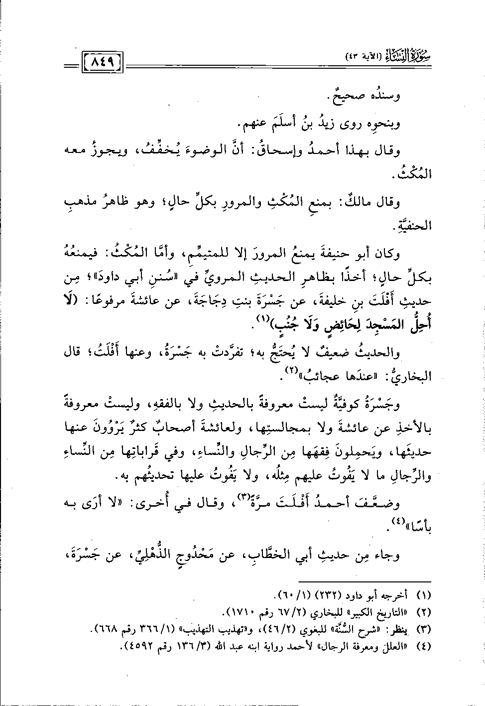 وكان أبو حنيفةَ يمنعُ المرورَ إلا للمتيمِّم، وأمَّا المُكْثُ: فيمنعُهُ بكلِّ حالٍ؛ أخذًا بظاهرِ الحديثِ المرويِّ في "سُننِ أبي داودَ"؛ مِن حديثِ أَفْلَتَ بنِ خليفةَ، عن جَسْرَةَ بنتِ دِجَاجَةَ، عن عائشةَ مرفوعًا: (لَا أُحِلُّ المَسْجِدَ لِحَائِضٍ وَلَا جُنُبٍ) (١).