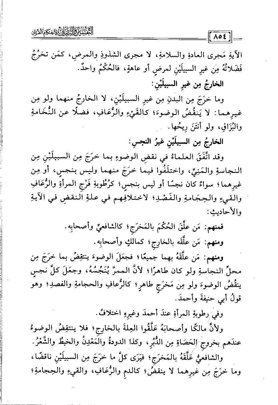 الآيةِ مَجرى العادةِ والسلامة، لا مجرى الشذوذِ والمرض، كمَن تخرُجُ فَضَلاتُهُ مِن غيرِ السبيلَيْنِ لمرضٍ أو عاهةٍ، فالحُكْمُ واحدٌ.