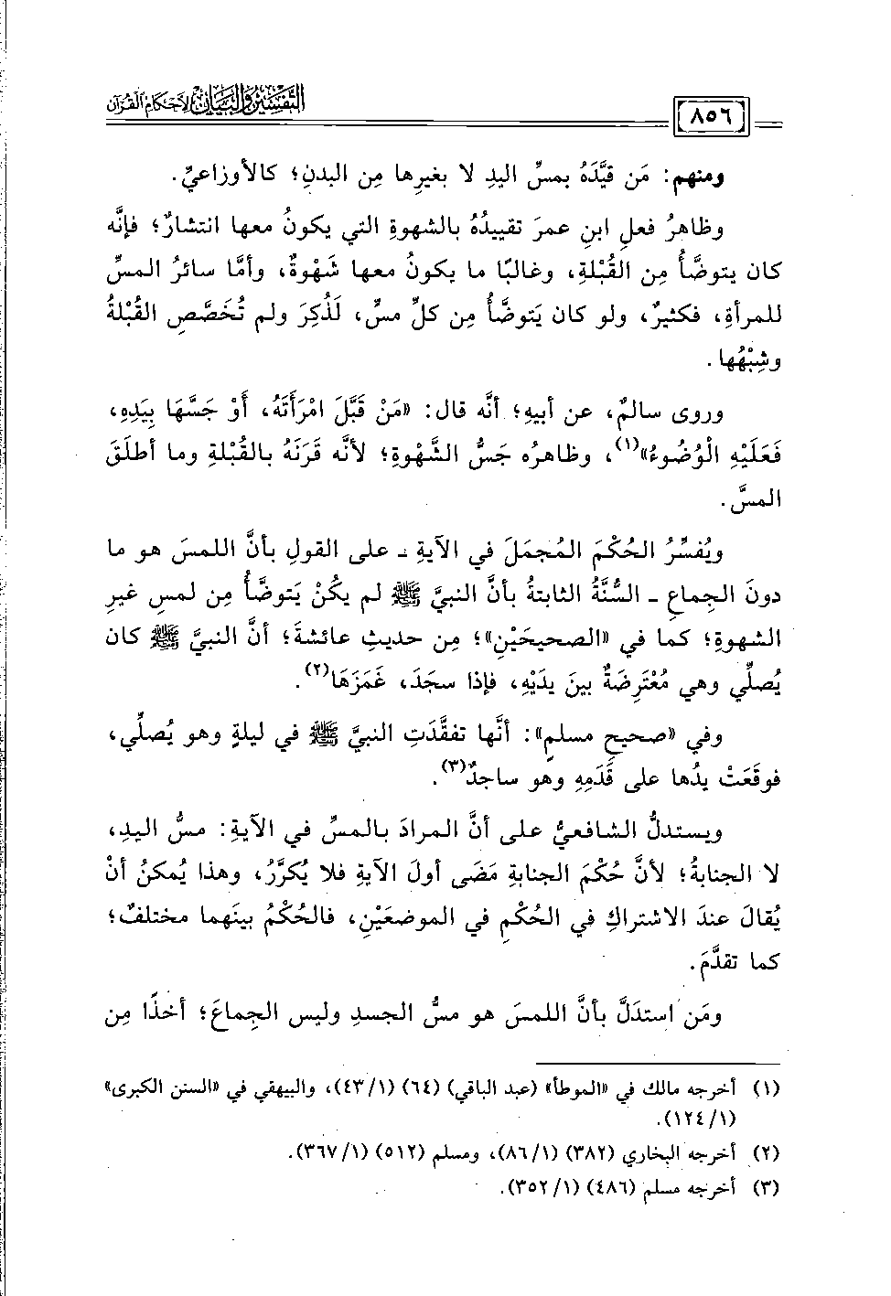 ويُفسِّرُ الحُكْمَ المُجمَلَ في الآيةِ - على القولِ بأنَّ اللمسَ هو ما دونَ الجِماعِ - السُّنَّةُ الثابتةُ بأنَّ النبيَّ - صلى الله عليه وسلم - لم يكُنْ يتوضَّأ مِن لمسِ غيرِ الشهوةِ؛ كما في "الصحيحَيْنِ"؛ من حديث عائشةَ؛ أنَّ النبيَّ - صلى الله عليه وسلم - كان يُصلِّي وهي مُعْتَرِضَةٌ بينَ يدَيْه، فإذا سجَدَ، غَمَزَهَا (٢).