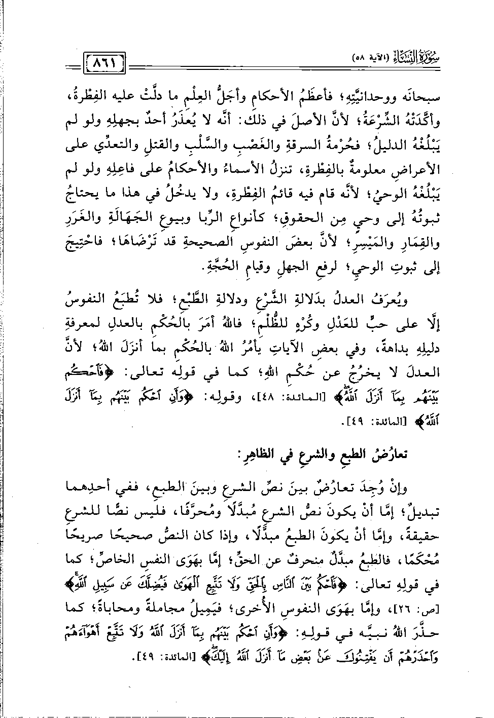 وإن وُجِدَ تعارُضٌ بينَ نصِّ الشرعِ وبينَ الطبع، ففي أحدِهما تبديلٌ؛ إمَّا أن يكونَ نصُّ الشرعِ مُبدَّلًا، ومُحرَّفًا، فليس نصًّا للشرعِ حقيقةً، وإمَّا أن يكونَ الطبع مبدَّلًا، وإذا كان النصُّ صحيحًا صريحًا مُحكَمًا، فالطبع مبدَّلٌ منحرفٌ عن الحقِّ؛ إمَّا بهَوَى النفسِ الخاصِّ؛ كما في قولهِ تعالى {فَاحْكُمْ بَيْنَ النَّاسِ بِالْحَقِّ وَلَا تَتَّبِعِ الْهَوَى فَيُضِلَّكَ عَنْ سَبِيلِ اللَّهِ} [ص: ٢٦] وإمَّا بهَوَى النفوسِ الأخرى؛ فيَمِيلُ مجاملةً ومحاباةً؛ كما حذَّرَ الله نبيَّه في قولهِ {وَأَنِ احْكُمْ بَيْنَهُمْ بِمَا أَنْزَلَ اللَّهُ وَلَا تَتَّبِعْ أَهْوَاءَهُمْ وَاحْذَرْهُمْ أَنْ يَفْتِنُوكَ عَنْ بَعْضِ مَا أَنْزَلَ اللَّهُ إِلَيْكَ} [المائدة: ٤٩].