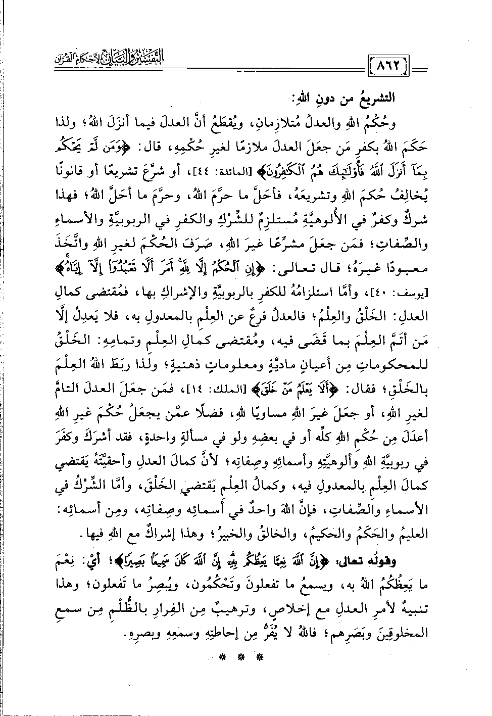 وحُكْمُ اللهِ والعدلُ مُتلازِمان، ويُقطَعُ أنَّ العدلَ فيما أنزلَ اللهُ؛ ولذا حَكَمَ اللهُ بكفرِ مَن جعَلَ العدلَ ملازمًا لغيرِ حُكمِه، قال: {وَمَنْ لَمْ يَحْكُمْ بِمَا أَنْزَلَ اللَّهُ فَأُولَئِكَ هُمُ الْكَافِرُونَ} [المائدة: ٤٤]، أو شرَّعَ تشريعًا أو قانونًا يُخالِفُ حُكمَ اللهِ وتشريعَهُ، فأحَلَّ ما حرَّمَ الله، وحرمَ ما أحَلَّ اللهُ؛ فهذا شركٌ وكفرٌ في الأُلوهيَّةِ مُستلزِمٌ للشِّرْكِ والكفرِ في الربوبيَّةِ والأسماءِ والصِّفاتِ؛ فمَن جعَلَ مشرِّعًا غيرَ الله، صَرَفَ الحُكمَ لغيرِ اللهِ واتَّخَذَ معبودًا غيرَهُ؛ قال تعالى: {إِنِ الْحُكْمُ إِلَّا لِلَّهِ أَمَرَ أَلَّا تَعْبُدُوا إِلَّا إِيَّاهُ} [يوسف: ٤٠]، وأمَّا استلزامُه للكفرِ بالربوبيَّةِ والإشراكِ بها، فمُقتضى كمالِ العدلِ: الخَلْقُ والعِلْمُ؛ فالعدلُ فرعٌ عن العِلْمِ بالمعدولِ به، فلا يَعدِلُ إلَّا مَن أتَمَّ العِلْمَ بما قَضَى فيه، ومُقتضى كمالِ العِلْمِ وتمامِهِ: الخَلقُ للمحكوماتِ مِن أعيانٍ ماديَّةٍ ومعلوماتٍ ذهنيةٍ؛ ولذا ربَطَ اللهُ العِلْمَ بالخَلْقِ؛ فقال: {أَلَا يَعْلَمُ مَنْ خَلَقَ} [الملك: ١٤]، فمَن جعَلَ العدلَ التامَّ لغيرِ الله، أو جعَلَ غيرَ اللهِ مساويًا لله، فضلًا عمَّن يجعَلُ حُكْمَ غيرِ اللهِ أعدَلَ عن حُكمِ اللهِ كلِّه أو في بعضهِ ولو في مسألةٍ واحدةٍ، فقد أشرَكَ وكفَرَ في ربوبيَّةِ اللهِ وألوهيَّتِهِ وأسمائِهِ وصفاتِه؛ لأنَّ كمالَ العدلِ وأحقيَّتَهُ يَقتضي كمالَ العِلْمِ بالمعدولِ فيه، وكمالُ العِلْم يَقتضي الخَلْقَ، وأمَّا الشِّركُ في الأسماءِ والصِّفات، فإنَّ اللهَ واحدٌ في أَسمائِه وصفاتِه، ومِن أسمائِه: العليمُ والحَكَمُ والحكيمُ، والخالقُ والخبيرُ؛ وهذا إشراكٌ مع اللهِ فيها.