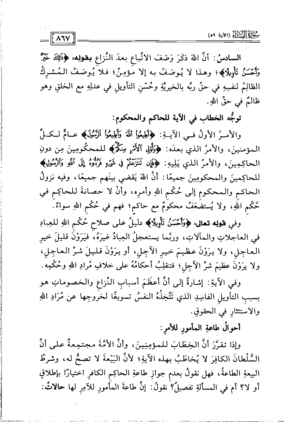 والأمرُ الأول في الآيةِ: {أَطِيعُوا اللَّهَ وَأَطِيعُوا الرَّسُولَ} عامٍّ لكلِّ المؤمنينَ، والأمرُ الذي بعدَه: {وَأُولِي الْأَمْرِ مِنْكُمْ} للمحكُومِينَ مِن دونِ الحاكمِينَ، والأمرُ الذي يَلِيهِ: {فَإِنْ تَنَازَعْتُمْ فِي شَيْءٍ فَرُدُّوهُ إِلَى اللَّهِ وَالرَّسُولِ} للحاكِمينَ والمحكومِينَ جميعًا: أنَّ اللهَ يَقضي بينَهم جميعًا، وفيه نزولُ الحاكم والمحكومِ إلى حُكمِ اللهِ وأمرِه، وأن لا حصانةَ للحاكِمِ في حُكمِ الله، ولا يستضعَفُ محكومٌ مع حاكمٍ؛ فهم في حُكمِ اللهِ سواء.