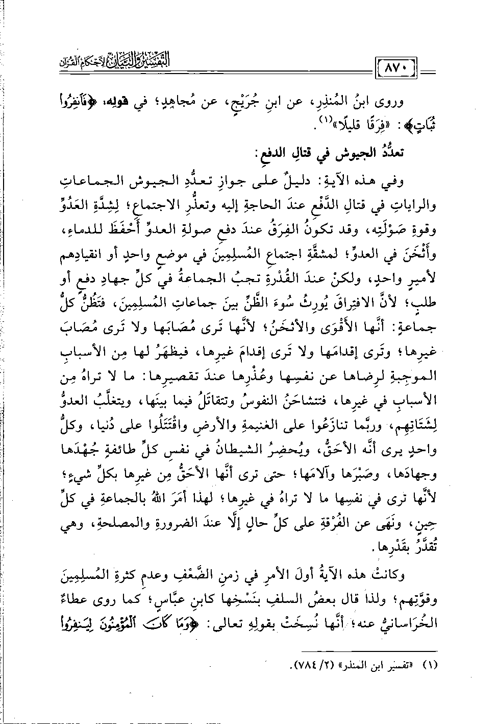 وفي هذه الآيةِ: دليلٌ على جوازِ تعددِ الجيوش الجماعاتِ والراياتِ في قَتالِ الدَّفْعِ عندَ الحاجةِ إليه وتعذُّرِ الاجتماع؛ لِشدةِ العدُوِّ وقوةِ صَولَتِه، وقد تكونُ الفِرَقُ عندَ دفعِ صولةِ العدوِّ أَحفَظَ للدماء، وأَثخَنَ في العدوِّ؛ لمشقةِ اجتماعِ المُسلِمينَ في موضعٍ واحدٍ أو انقيادِهم لأميرٍ واحدٍ، ولكنْ عندَ القُدرةِ تجُب الجماعةُ في كل جهادِ دفع أو طلبٍ؛ لأنَّ الافتِراق يُورِثُ سوءَ الظَّنِّ بينَ جماعاتِ المسلِمِين، فتَظُنُّ كلُّ جماعةٍ: أنَّها الأقوَى والأثخَنُ؛ لأنّها تَرى مُصَابَها ولا ترى مُصَابَ غيرها؛ وتَرى إقدامَها ولا تَرى إقدامَ غيرها، فيظهَرُ لها مِن الأسباب الموجبةِ لرِضاها عن نفسِها وعُذرِها عند تقصيرِها: ما لا تراهُ مِن الأسبابِ في غيرِها، فتتشاحَنُ النفوس وتتقاتَلُ فيما بينها، ويتغلب العدو لشتاتِهِم، وربّما تنازَعُوا على الغنيمةِ والأرضِ واقتَتَلُوا على دنيا، وكل واحدٍ يرى أَنَّه الأحَق، ويُحضِر الشيطانُ في نفس كلِّ طائفةٍ جهدها وجهادَها، وصَبرَها وآلامَها؛ حتى ترى أنَّها الأحَق مِن غيرِها بكلِّ شيءٍ؛ لأنَّها ترى في نفسِها ما لا تراهُ في غيرِها؛ لهذا أمَرَ اللهُ بالجماعةِ في كلِّ حِينٍ، ونَهَى عن الفرقةِ على كل حالِ إلا عندَ الضرورةِ والمصلحة، وهي تقدر بقدرها.