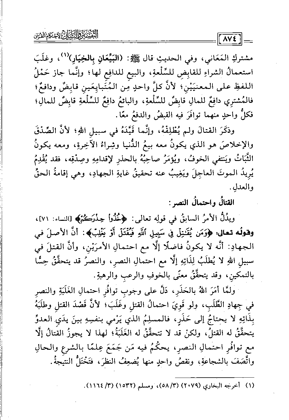 ويدُلُّ الأمرُ السابقُ في قولِه تعالى: {خُذُوا حِذْرَكُمْ} [النساء: ٧١]، وقولُه تعالى: {وَمَنْ يُقَاتِلْ فِي سَبِيلِ اللَّهِ فَيُقْتَلْ أَوْ يَغْلِبْ}: أن الأصلَ في الجهادِ: أنَّه لا يكونُ فاضلًا إلَّا مع احتمالِ الأمرين، وأن القتلَ في سبيلِ اللهِ لا يُطلَبُ لِذَاتِهِ إلَّا مع احتمالِ النصر، والنصرُ قد يتحققُ حِسًّا بالتمكين، وقد يتحقَّقُ معنًى بالخوفِ والرعب والرهبةِ.