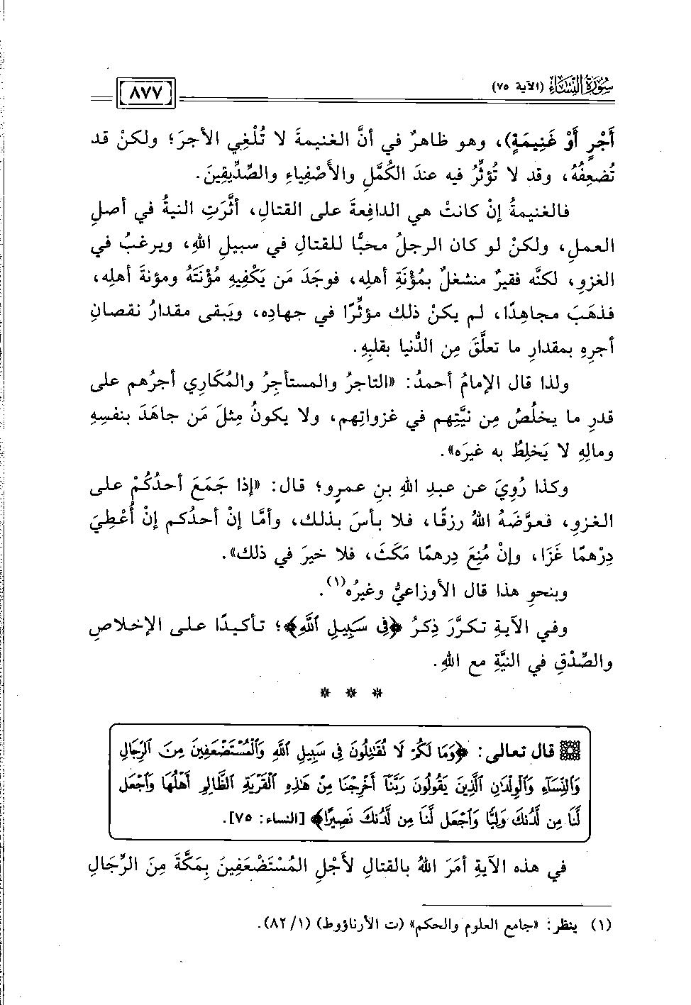 أَجْرٍ أو غنِيمَةٍ)، وهو ظاهرٌ في أن الغنيمةَ لا تُلغِي الأجرَ؛ ولكن قد تُضعِفُهُ، وقد لا تُؤثِّرُ فيه عندَ الكُمَّلِ والأصفِياء والصِّدِّيقِينَ.