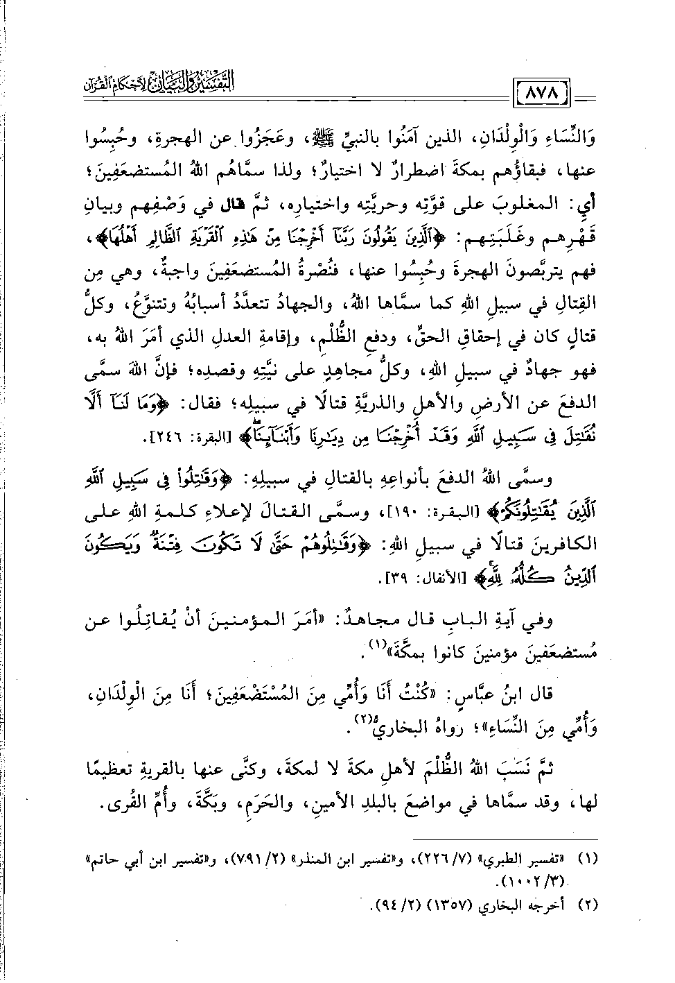 وَالنِّسَاءِ وَالوِلدَانِ، الذين آمَنُوا بالنبيِّ - صلى الله عليه وسلم -، وعَجَزُوا عن الهجرةِ، وحبسُوا عنها، فبقاؤُهم بمكةَ اضطرارٌ لا اختيارٌ؛ ولذا سماهم الله المُستضعَفِين؛ أيِ: المغلوبَ على قوَّتِه وحريَّتِه واختيارِه، ثم قال في وَصفِهم وبيانِ قَهْرِهم وغَلَبَتِهم: {الَّذِينَ يَقُولُونَ رَبَّنَا أَخْرِجْنَا مِنْ هَذِهِ الْقَرْيَةِ الظَّالِمِ أَهْلُهَا}، فهم يتربَّصونَ الهجرةَ وحُبِسُوا عنها، فنصْرةُ المستضعفينَ واجبةٌ، وهي مِن القِتالِ في سبيلِ اللهِ كما سمَّاها اللهُ، والجهادُ تتعددُ أسبابُهُ وتتنوعُ، وكلُّ قتالٍ كان في إحقاقِ الحقِّ، ودفعِ الظُّلْم، وإقامةِ العدلِ الذي أمَرَ اللهُ به، فهو جهادٌ في سبيلِ الله، وكلُّ مجاهِدٍ على نيته وقصدِه؛ فإن الله سمى الدفعَ عن الأرضِ والأهلِ والذريةِ قتالًا في سبيلِه؛ فقال: {وَمَا لَنَا أَلَّا نُقَاتِلَ فِي سَبِيلِ اللَّهِ وَقَدْ أُخْرِجْنَا مِنْ دِيَارِنَا وَأَبْنَائِنَا} [البقرة: ٢٤٦].