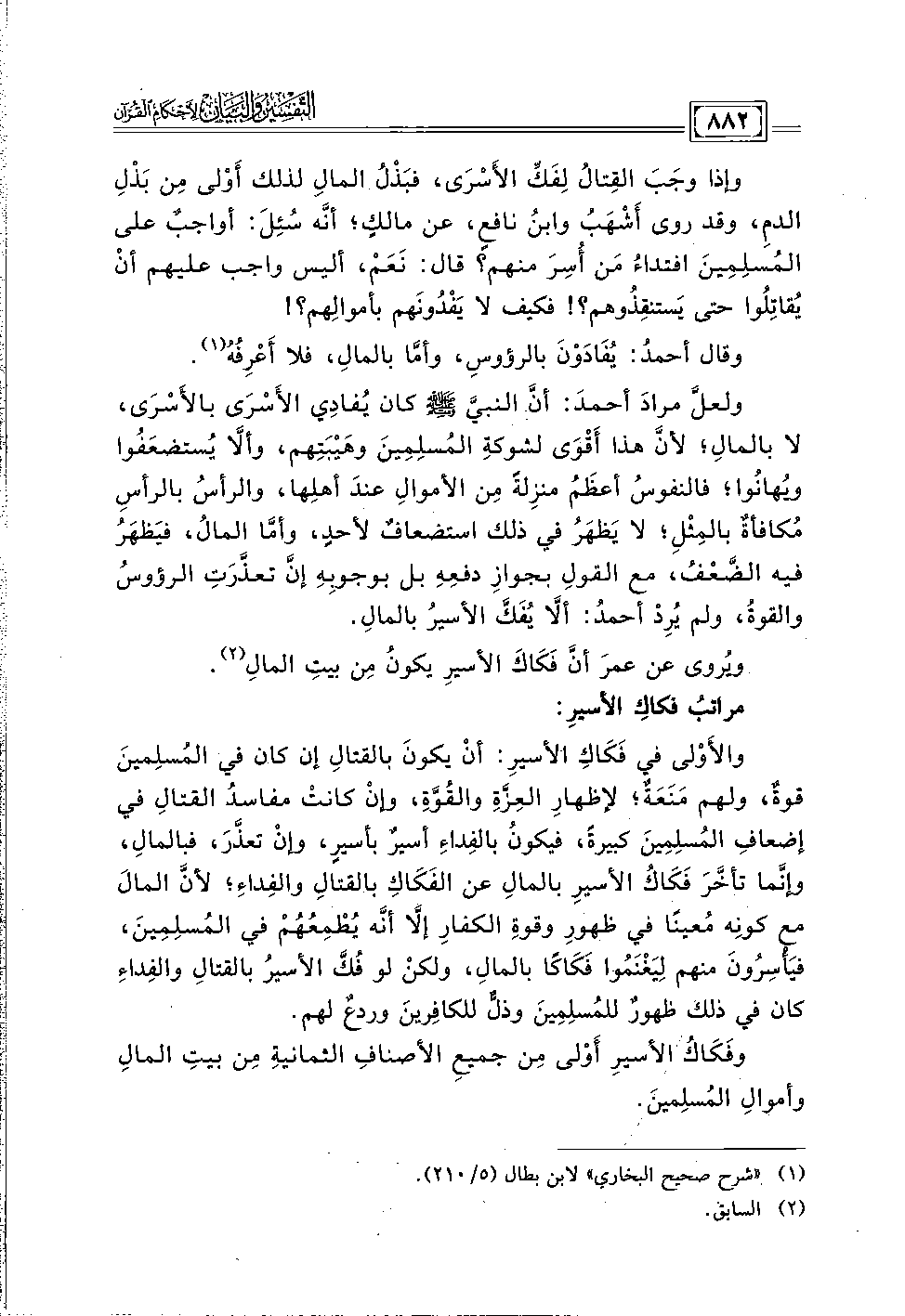وإذا وجَبَ القِتالُ لِفَكِّ الأسرَى، فبَذلُ المالِ لذلك أَولى مِن بَذلِ الدمِ، وقد روى أشْهَبُ وابن نافعٍ، عن مالكٍ؛ أنَّه سُئِلَ: أواجبٌ على المُسلِمينَ افتداءُ مَن أُسِرَ منهم؟ قال: نَعَمْ، أليس واجب عليهم أن يُقاتِلُوا حتَّى يَستنقِذُوهم؟ ! فكيف لا يَفدُونَهم بأموالِهم؟ !