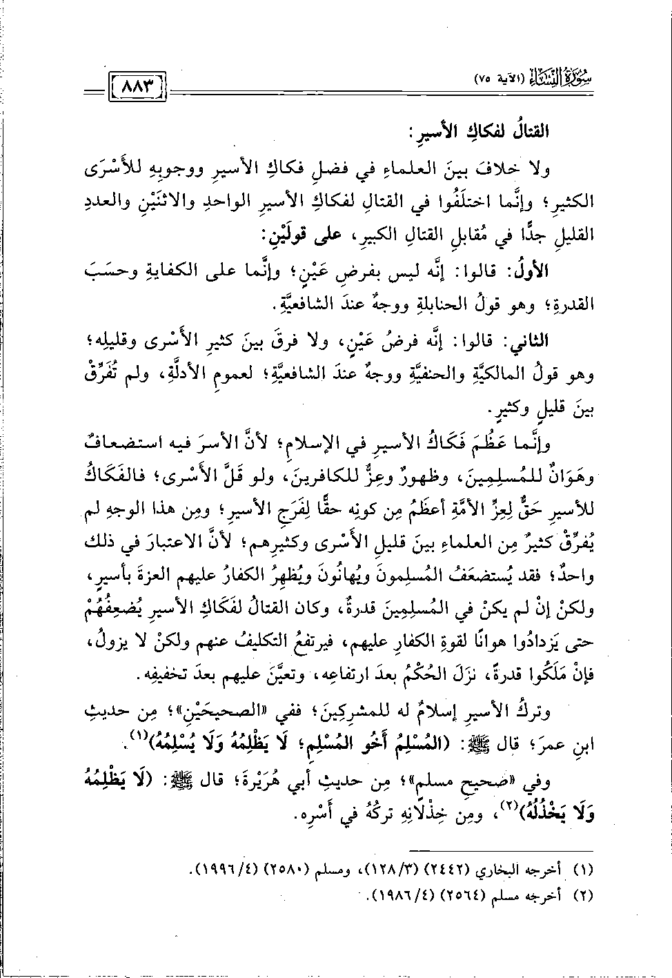 ولا خلافَ بينَ العلماءِ في فضلِ فكاكِ الأسيرِ ووجوبِهِ للأَسرَى الكثيرِ؛ وإنَّما اختلَفُوا في القتالِ لفكاكِ الأسيرِ الواحدِ والاثنَيْنِ والعددِ القليلِ جدًّا في مُقابلِ القتالِ الكبير، على قولَينِ: