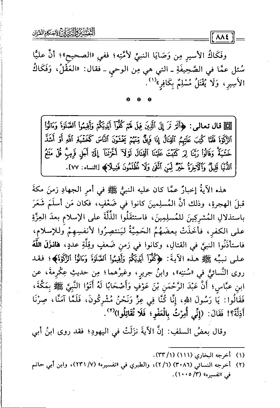 هذه الآية إخبارٌ عما كان عليه النَّبيُّ - صلى الله عليه وسلم - في أمرِ الجهادِ زمنَ مكَّةَ قبلَ الهجرةِ، وذلك أن المسلِمينَ كانوا في ضَعْفٍ، فكان من أسلَمَ شعرَ باستذلالِ المُشركِينَ للمسلِمِينَ، فاستثقَلُوا الذِّلَّةَ على الإسلامِ بعدَ العِزةِ على الكفر، فأخَذَت بعضَهُمُ الحَمِيةُ ليَنتصِرُوا لأنفسهم وللإسلام، فاستأذَنوا النَّبيَّ في القتال، وكانوا في زمن ضعفٍ وقلَّةِ عددٍ، فأنزَلَ اللَّه على نبيه - صلى الله عليه وسلم - هذه الآيةَ: {كُفُّوا أَيْدِيَكُمْ وَأَقِيمُوا الصَّلَاةَ وَآتُوا الزَّكَاةَ}؛ فقد روى النَّسائي في "سننه"، وابن جريرٍ، وغيرهما؛ مِن حديثِ عِكرِمةَ، عن ابنِ عبَّاسٍ؛ أَن عَبدَ الرَّحمَنِ بنَ عَوفٍ وَأصحَابًا لَهُ أتوُا النبي - صلى الله عليه وسلم - بِمَكةَ، فَقَالُوا: يَا رَسُولَ الله، إِنا كُنّا فِي عِزٍّ وَنحنُ مُشرِكُون، فلما آمنا، صِرنا أَذِلَّةً؟ ! فَقَالَ: (إنِّي أُمِرْتُ بِالعَفْوِ؛ فَلَا تُقَاتِلُوا) (٢).