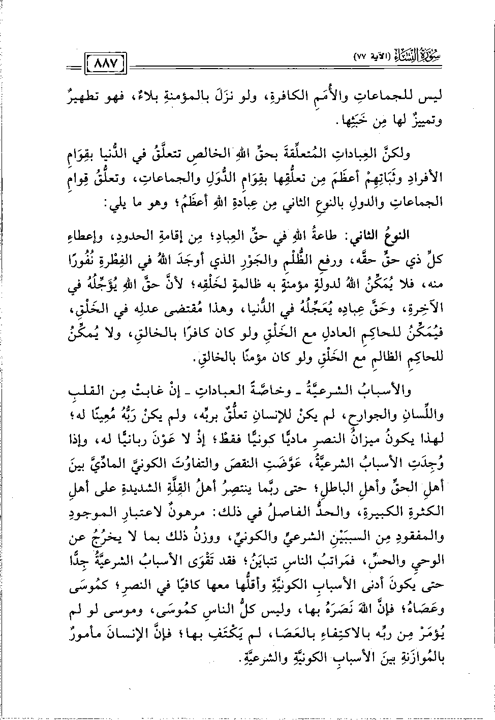 ولكنَّ العِباداتِ المُتعلِّقةَ بحقِّ اللهِ الخالصِ تتعلَّقُ في الدُّنيا بقِوَامِ الأفرادِ وثَبَاتِهِم أعظَمَ مِن تعلُّقِها بقِوَامِ الدُّوَلِ والجماعات، وتعلُّقُ قِوامِ الجماعاتِ والدولِ بالنوعِ الثَّاني مِن عِبادةِ اللهِ أعظَمُ؛ وهو ما يلي: