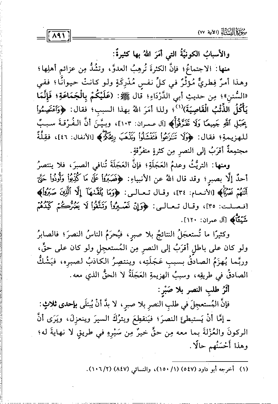 ومنها: التريُّثُ وعدمُ العَجَلَةِ؛ فإن العجلَةَ تُنافي الصبرَ، فلا ينتصر أحدٌ إلَّا بصبرٍ؛ وقد قال اللهُ عن الأنبياءِ: {فَصَبَرُوا عَلَى مَا كُذِّبُوا وَأُوذُوا حَتَّى أَتَاهُمْ نَصْرُنَا} [الأنعام: ٣٤]، وقال تعالى: {وَمَا يُلَقَّاهَا إِلَّا الَّذِينَ صَبَرُوا} [فصلت: ٣٥]، وقال تعالى: {وَإِنْ تَصْبِرُوا وَتَتَّقُوا لَا يَضُرُّكُمْ كَيْدُهُمْ شَيْئًا} [آل عمران: ١٢٠].