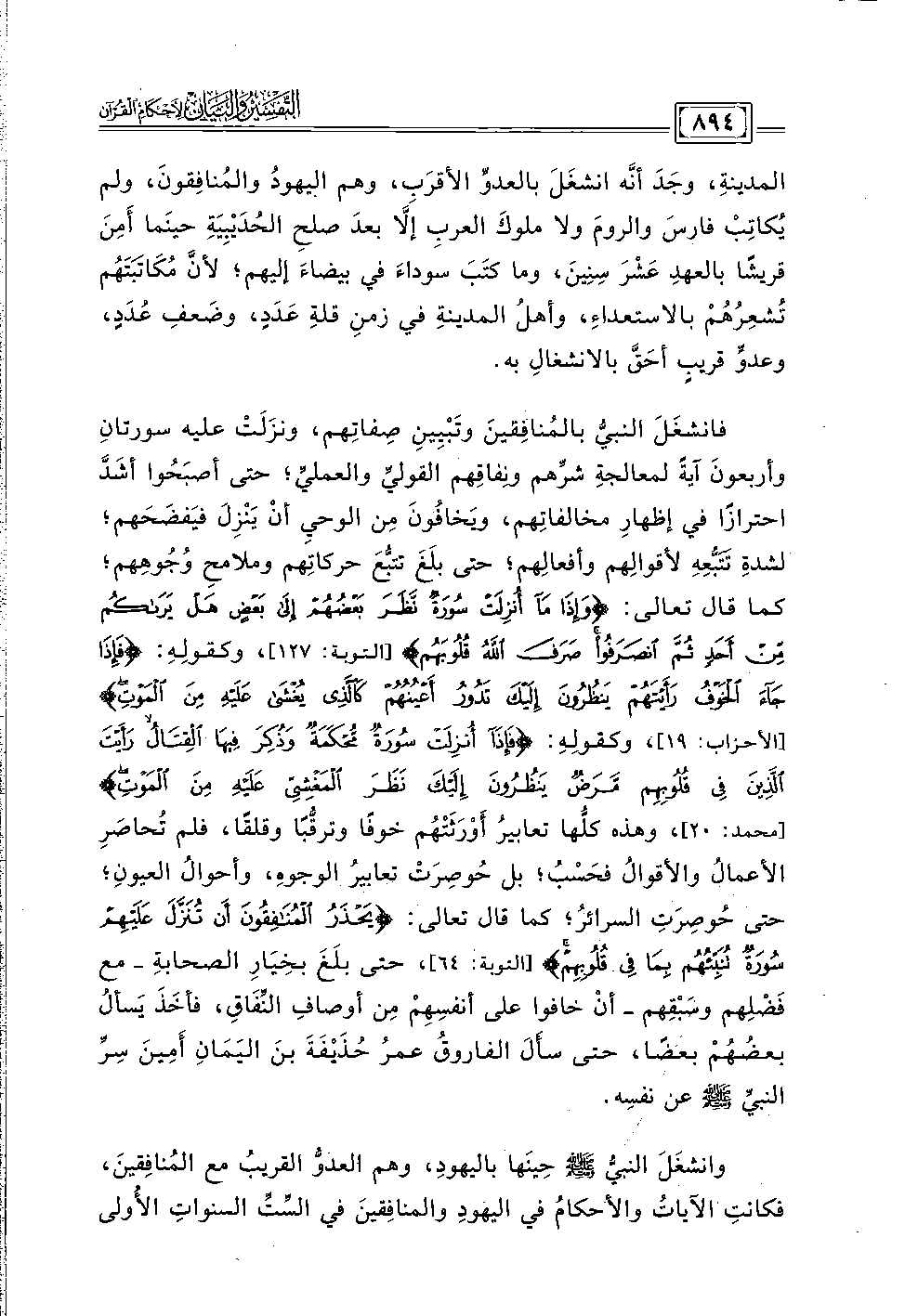 وانشغَلَ النَّبيُّ - صلى الله عليه وسلم - حِينَها باليهود، وهم العدوُّ القريبُ مع المنافقينَ، فكانتِ الآياتُ والأحكامُ في اليهودِ والمنافِقينَ في السِّتِّ السنواتِ الأولى