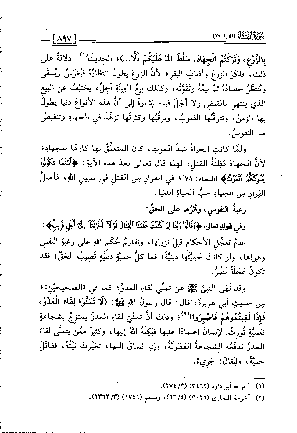 ولمَّا كانتِ الحياةُ ضدَّ الموت، كان المتعلِّقُ بها كارهًا للجهادِ؛ لأنَّ الجهادَ مَظِنَّهُ القتلِ؛ لهذا قال تعالى بعدَ هذه الآيةِ: {أَيْنَمَا تَكُونُوا يُدْرِكْكُمُ الْمَوْتُ} [النساء: ٧٨]؛ في الفرارِ مِن القتلِ في سبيلِ الله، فأصلُ الفِرارِ مِن الجهادِ حبُّ الحياةِ الدنيا.