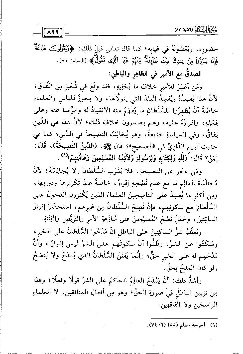 ومَن أظهَرَ للأميرِ خلافَ ما يُخفِيهِ، فقد وقَعَ في شُعْبةٍ مِن النِّفاقِ؛ لأنَّ هذا يُفسِدُهُ ويُفسِدُ البلدَ التي يتولَّاها، ولا يجوزُ للناسِ والعلماءِ خاصَّةً أنْ يُظهِرُوا للسُّلْطانِ ما يُفهَمُ منه الانقيادُ له والرِّضا عنه وعلى فِعْلِه، وإقرارُهُ عليه، وهم يضمرون خلافَ ذلك؛ لأنَّ هذا في الدِّينِ نِفاقٌ، وفي السياسةِ خديعةٌ، وهو يُخالِفُ النصيحةَ في الدِّينِ؛ كما في حديثِ تَمِيمٍ الدَّارِيِّ في "الصحيحِ"؛ قال - صلى الله عليه وسلم -: (الدِّينُ النَّصِيحَةُ)، قُلْنَا: لِمَنْ؟ قَالَ: (لِلَّهِ وَلِكِتَابِهِ وَلِرَسُولِهِ وَلأَئِمَّةِ المُسْلِمِينَ وَعَامَّتِهِمْ) (١).