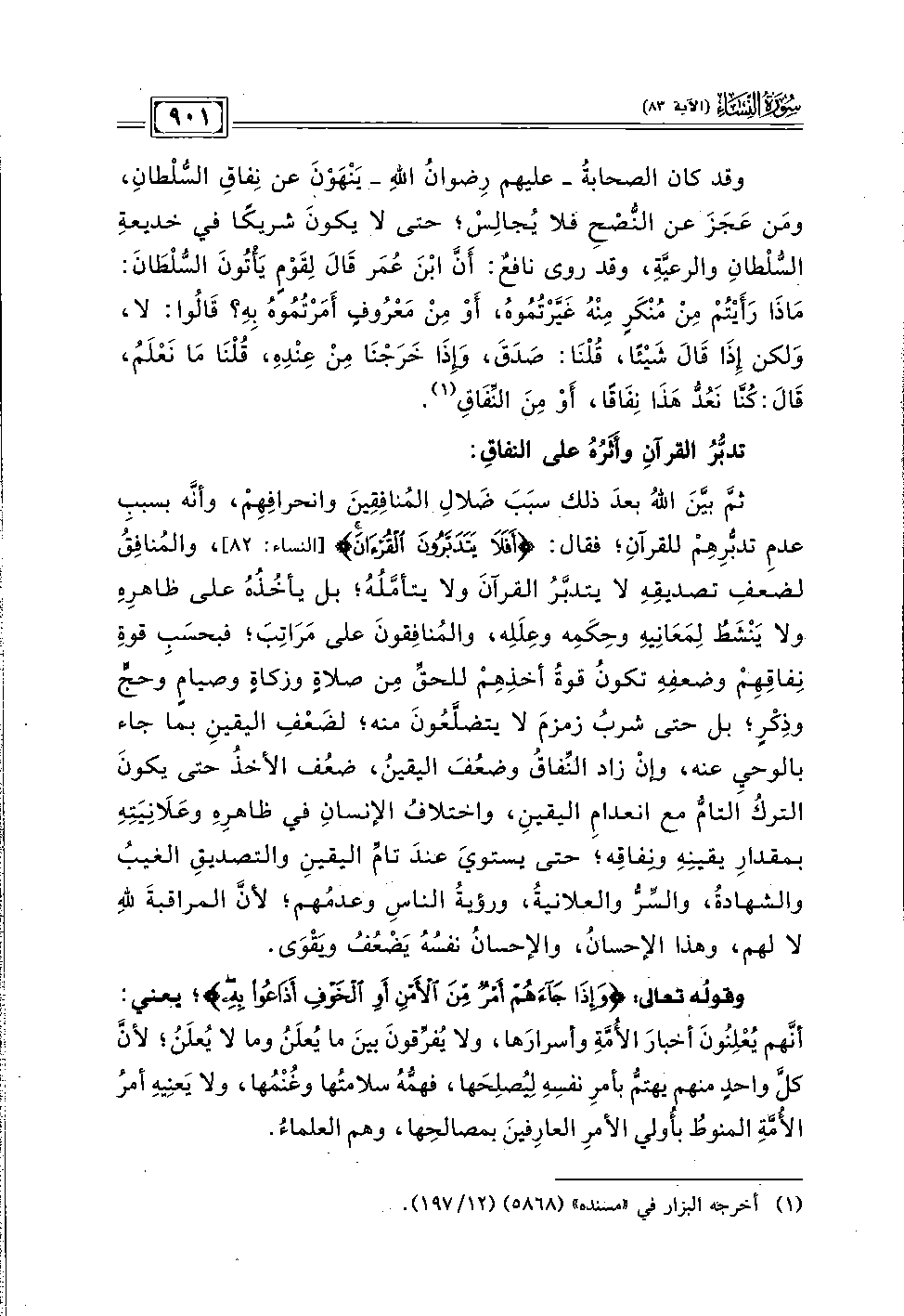 ثمَّ بيَّنَ اللهُ بعدَ ذلك سبَبَ ضَلالِ المُنافِقِينَ وانحرافِهِمْ، وأنَّه بسببِ عدمِ تدبُّرِهِمْ للقرآنِ؛ فقال: {أَفَلَا يَتَدَبَّرُونَ الْقُرْآنَ} [النساء: ٨٢]، والمُنافِقُ لضعفِ تصديقِهِ لا يتدبَّرُ القرآنَ ولا يتأمَّلُهُ؛ بل يأخُذُهُ على ظاهرِهِ ولا يَنْشَطُ لِمَعَانِيهِ وحِكَمِه وعِلَلِه، والمُنافِقونَ على مَرَاتِبَ؛ فبحسَبِ قوةِ نِفاقِهِمْ وضعفِهِ تكونُ قوةُ أخذِهِمْ للحقِّ مِن صلاةٍ وزكاةٍ وصيامٍ وحجِّ وذِكْرٍ؛ بل حتى شربُ زمزمَ لا يتضلَّعُونَ منه؛ لضَعْفِ اليقينِ بما جاء بالوحيِ عنه، وإنْ زاد النِّفاقُ وضعُفَ اليقينُ، ضعُف الأخذُ حتى يكونَ التركُ التامُّ مع انعدامِ اليقين، واختلافُ الإنسانِ في ظاهرِهِ وعَلَانِيَتِهِ بمقدارِ يقينِهِ ونِفاقِه؛ حتى يستويَ عندَ تامِّ اليقينِ والتصديقِ الغيبُ والشهادةُ، والسِّرُّ والعلانيةُ، ورؤيةُ الناسِ وعدمُهم؛ لأنَّ المراقبةَ للهِ لا لهم، وهذا الإحسانُ، والإحسانُ نفسُهُ يَضْعُفُ ويَقْوَى.