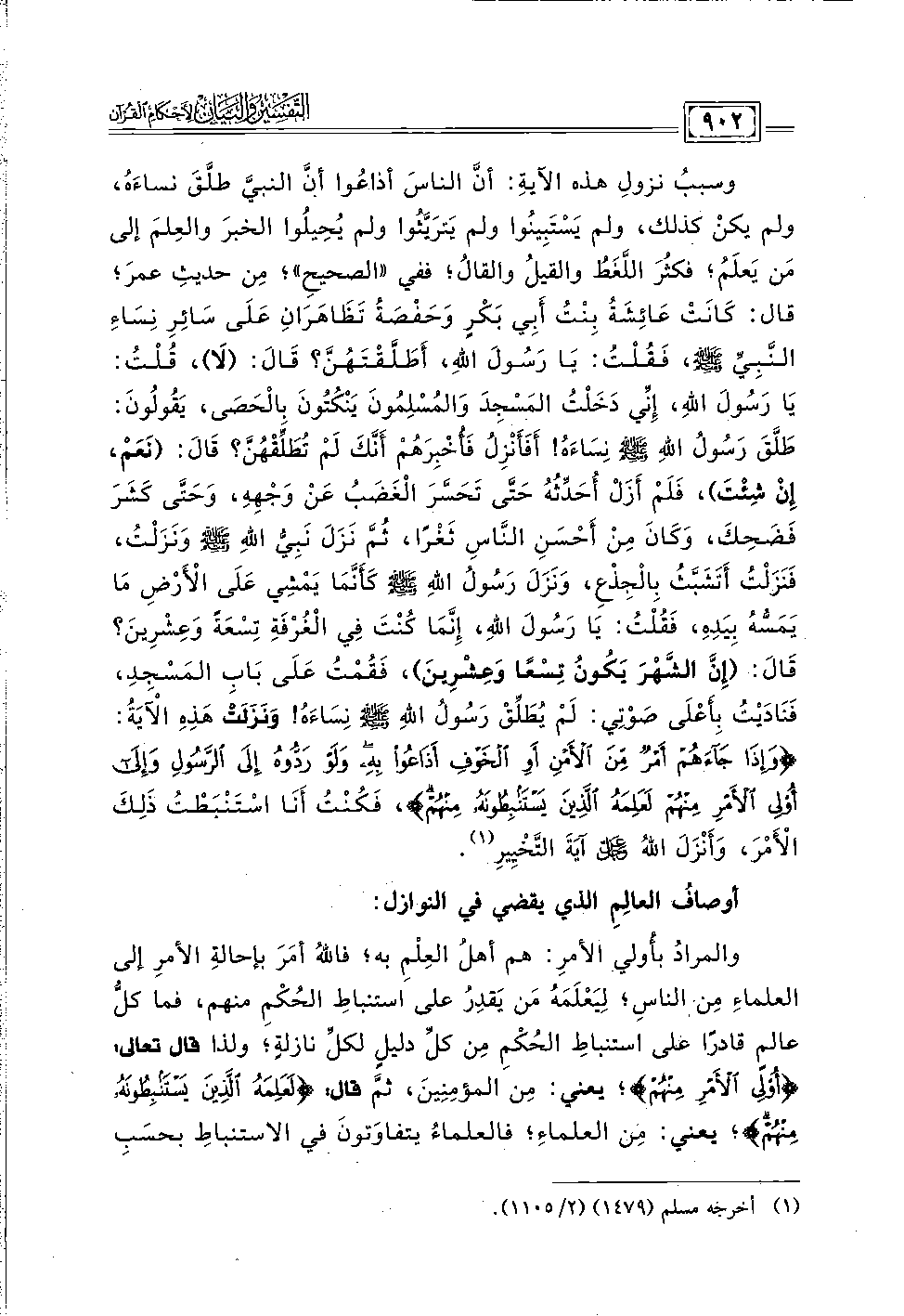 وسببُ نزولِ هذه الآيةِ: أنَّ الناسَ أذاعُوا أنَّ النبيَّ طلَّقَ نساءَهُ، ولم يكنْ كذلك، ولم يَسْتَبِينُوا ولم يَترَيَّثُوا ولم يُحِيلُوا الخبرَ والعِلمَ إلى مَن يَعلَمُ؛ فكثُرَ اللَّغَطُ والقيلُ والقالُ؛ ففي "الصحيحِ"؛ مِن حديثِ عمرَ؛ قال: كَانَتْ عَائِشَةُ بِنْتُ أَبِي بَكْرٍ وَحَفْصَةُ تَظَاهَرَانِ عَلَى سَائِرِ نِسَاءِ النَّبِيِّ - صلى الله عليه وسلم -، فَقُلْتُ: يَا رَسُولَ الله، أَطَلَّقْتَهُنَّ؟ قَالَ: (لَا)، قُلْتُ: يَا رَسُولَ الله، إِنِّي دَخَلْتُ المَسْجِدَ وَالمُسْلِمُونَ يَنْكُتُونَ بِالْحَصَى، يَقُولُونَ: طَلَّقَ رَسُولُ اللهِ - صلى الله عليه وسلم - نِسَاءَهُ! أَفَأَنْزِلُ فَأُخْبِرَهُمْ أَنَّكَ لَمْ تُطَلِّقْهُنَّ؟ قَالَ: (نَعَمْ، إِنْ شِئْتَ)، فَلَمْ أَزَلْ أُحَدِّثُهُ حَتَّى تَحَسَّرَ الْغَضَبُ عَنْ وَجْهِه، وَحَتَّى كَشَرَ فَضَحِكَ، وَكَانَ مِنْ أَحْسَنِ النَّاسِ ثَغْرًا، ثُمَّ نَزَلَ نَبِيُّ اللهِ - صلى الله عليه وسلم - وَنَزَلْتُ، فَنَزَلْتُ أَتَشَبَّثُ بِالْجِذْع، وَنَزَلَ رَسُولُ اللهِ - صلى الله عليه وسلم - كَأَنَّمَا يَمْشِي عَلَى الْأَرْضِ مَا يَمَسُّهُ بِيَدِه، فَقُلْتُ: يَا رَسُولَ الله، إِنَّمَا كُنْتَ فِي الْغُرْفَةِ تِسْعَةً وَعِشْرِينَ؟ قَالَ: (إِنَّ الشَّهْرَ يَكُونُ تِسْعًا وَعِشْرِينَ)، فَقُمْتُ عَلَى بَابِ المَسْجِدِ، فَنَادَيْتَ بِأَعْلَى صَوْتِي: لَمْ يُطَلِّقْ رَسُولُ اللهِ - صلى الله عليه وسلم - نِسَاءَهُ! وَنَزَلَتْ هَذِهِ الْآيَةُ: {وَإِذَا جَاءَهُمْ أَمْرٌ مِنَ الْأَمْنِ أَوِ الْخَوْفِ أَذَاعُوا بِهِ وَلَوْ رَدُّوهُ إِلَى الرَّسُولِ وَإِلَى أُولِي الْأَمْرِ مِنْهُمْ لَعَلِمَهُ الَّذِينَ يَسْتَنْبِطُونَهُ مِنْهُمْ}، فَكُنْتُ أَنَا اسْتَنْبَطْتُ ذَلِكَ الْأَمْرَ، وَأَنْزَلَ اللهُ عز وجل آيَةَ التَّخْيِيرِ (١).