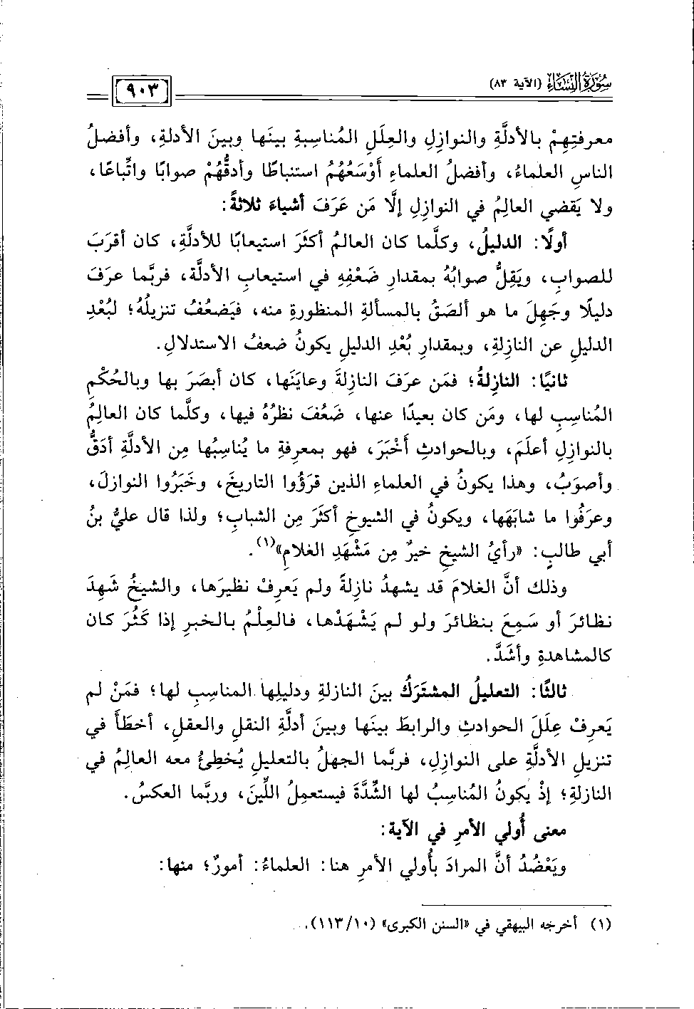 ثانيًا: النازِلةُ؛ فمَن عرَفَ النازِلةَ وعايَنَها، كان أبصَرَ بها وبالحُكْمِ المُناسِبِ لها، ومَن كان بعيدًا عنها، ضَعُفَ نظرُهُ فيها، وكلَّما كان العالِمُ بالنوازِلِ أعلَمَ، وبالحوادثِ أَخْبَرَ، فهو بمعرِفةِ ما يُناسِبُها مِن الأدلَّةِ أدَقُّ وأصوَبُ، وهذا يكونُ في العلماءِ الذين قرَؤُوا التاريخَ، وخَبَرُوا النوازلَ، وعرَفُوا ما شابَهَها، ويكونُ في الشيوخِ أكثَرَ مِن الشبابِ؛ ولذا قال عليُّ بنُ أبي طالبٍ: "رأيُ الشيخِ خيرٌ مِن مَشْهَدِ الغلامِ" (١).