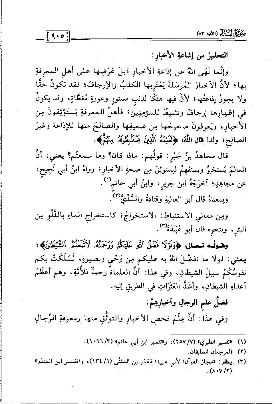 وإنَّما نَهَى اللهُ عن إذاعةِ الأخبارِ قبلَ عَرْضِها على أهلِ المعرِفةِ بها؛ لأنَّ الأخبارَ المُرسَلةَ يَعْتَرِيها الكذبُ والإرجافُ؛ فقد تكونُ حقًّا ولا يجوزُ إذاعتُها؛ لأنَّ فيها هتكًا لذنبٍ مستورٍ وعورةٍ مُغطَّاةٍ، وقد يكونُ في إظهارِها إرجافٌ وتثبيطٌ للمؤمِنِين؛ فأهلُ المعرفةِ يَستَوْثِقونَ مِن الأخبار، وَيَعرِفونَ صحيحَها مِن ضعيفِها والصالحَ منها للإذاعة وغيرَ الصالِحِ؛ ولذا قال اللهُ: {لَعَلِمَهُ الَّذِينَ يَسْتَنْبِطُونَهُ مِنْهُمْ}.