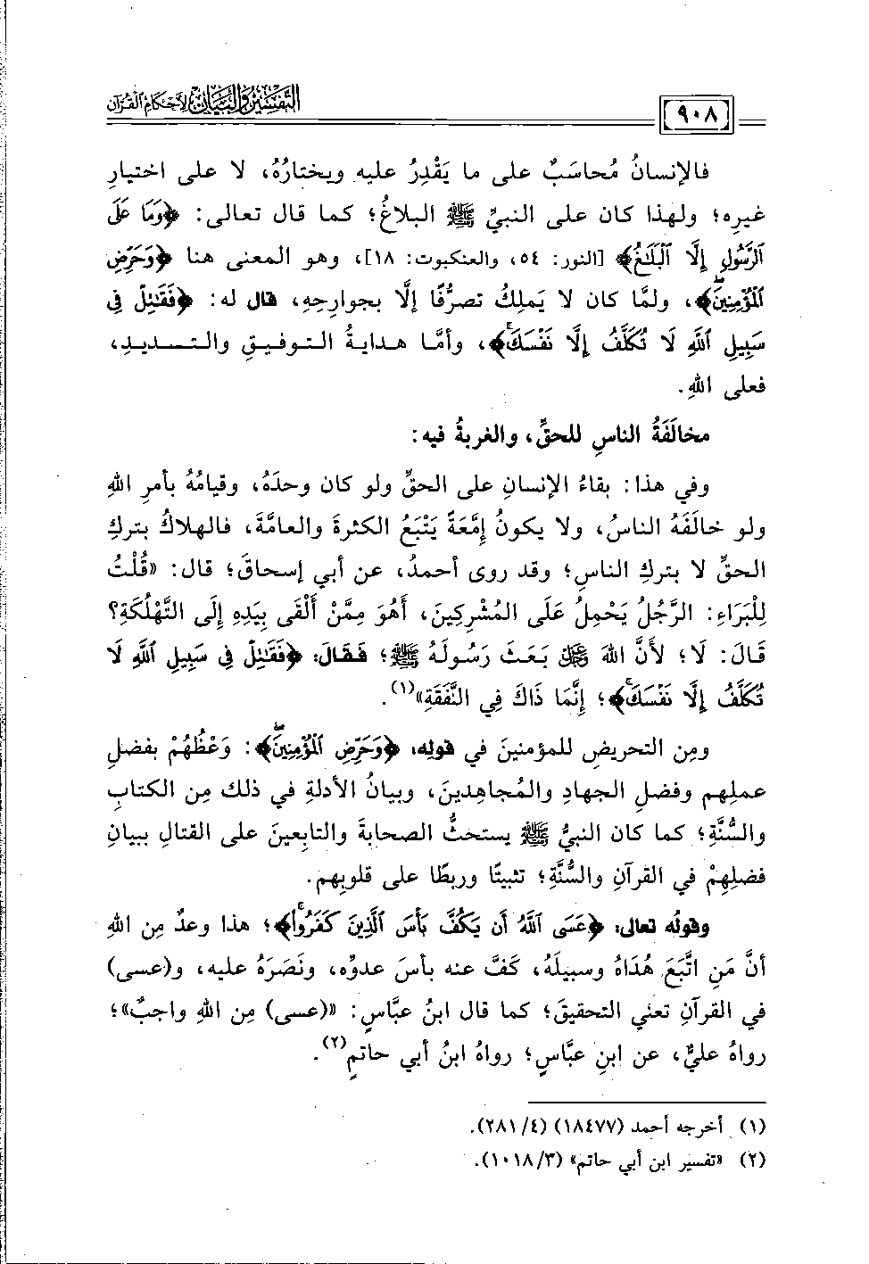 فالإنسانُ مُحاسَبٌ على ما يَقْدِرُ عليه ويختارُهُ، لا على اختيارِ غيرِه؛ ولهذا كان على النبيِّ - صلى الله عليه وسلم - البلاغُ؛ كما قال تعالى: {وَمَا عَلَى الرَّسُولِ إِلَّا الْبَلَاغُ} [النور: ٥٤، والعنكبوت: ١٨]، وهو المعنى هنا {وَحَرِّضِ الْمُؤْمِنِينَ}، ولمَّا كان لا يَملِكُ تصرُّفًا إلَّا بجوارِحِه، قال له: {فَقَاتِلْ فِي سَبِيلِ اللَّهِ لَا تُكَلَّفُ إِلَّا نَفْسَكَ}، وأمَّا هدايةُ التوفيقِ والتسديد، فعلى اللهِ.