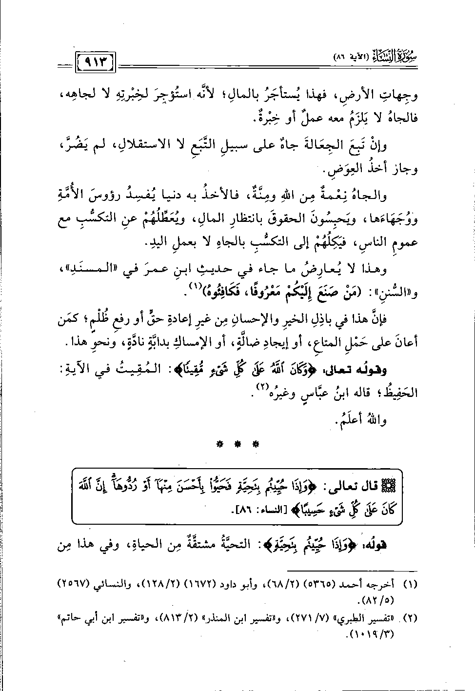 * قال تعالى: {وَإِذَا حُيِّيتُمْ بِتَحِيَّةٍ فَحَيُّوا بِأَحْسَنَ مِنْهَا أَوْ رُدُّوهَا إِنَّ اللَّهَ كَانَ عَلَى كُلِّ شَيْءٍ حَسِيبًا} [النساء: ٨٦].