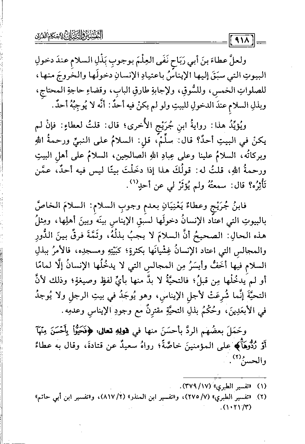 فابنُ جُرَيْجٍ وعطاءٌ يَعْنِيَانِ بعدمِ وجوبِ السلامِ: السلامَ الخاصَّ بالبيوتِ التي اعتاد الإنسانُ دخولَها لسبقِ الإيناسِ بينَة وبينَ أهلِها، ومِثلُ هذه الحالِ: الصحيحُ أنَّ السلامَ لا يجبُ بذلُهُ، وثَمَّةَ فرقٌ بينَ الدُّورِ والمجالسِ التي اعتاد الإنسانُ غِشْيانَها بكثرةٍ؛ كَبْيتِهِ ومسجدِه، فالأمرُ ببذلِ السلامِ فيها أخَفُّ وأيسَرُ مِن المجالسِ التي لا يدخُلُها الإنسانُ إلَّا لمامًا أو لم يدخُلْها مِن قبلُ؛ فالتحيَّةُ لابدَّ منها بأيِّ لفظٍ وصيغةٍ؛ وذلك لأنَّ التحيَّةَ إنَّما شُرِعَتْ لأجلِ الإيناس، وهو يُوجَدُ في بيتِ الرجلِ ولا يُوجدُ في الأبعَدِينَ، وحُكْمُ بذلِ التحيَّةِ مقترِنٌ مع وجودِ الإيناسِ وعدمِه.