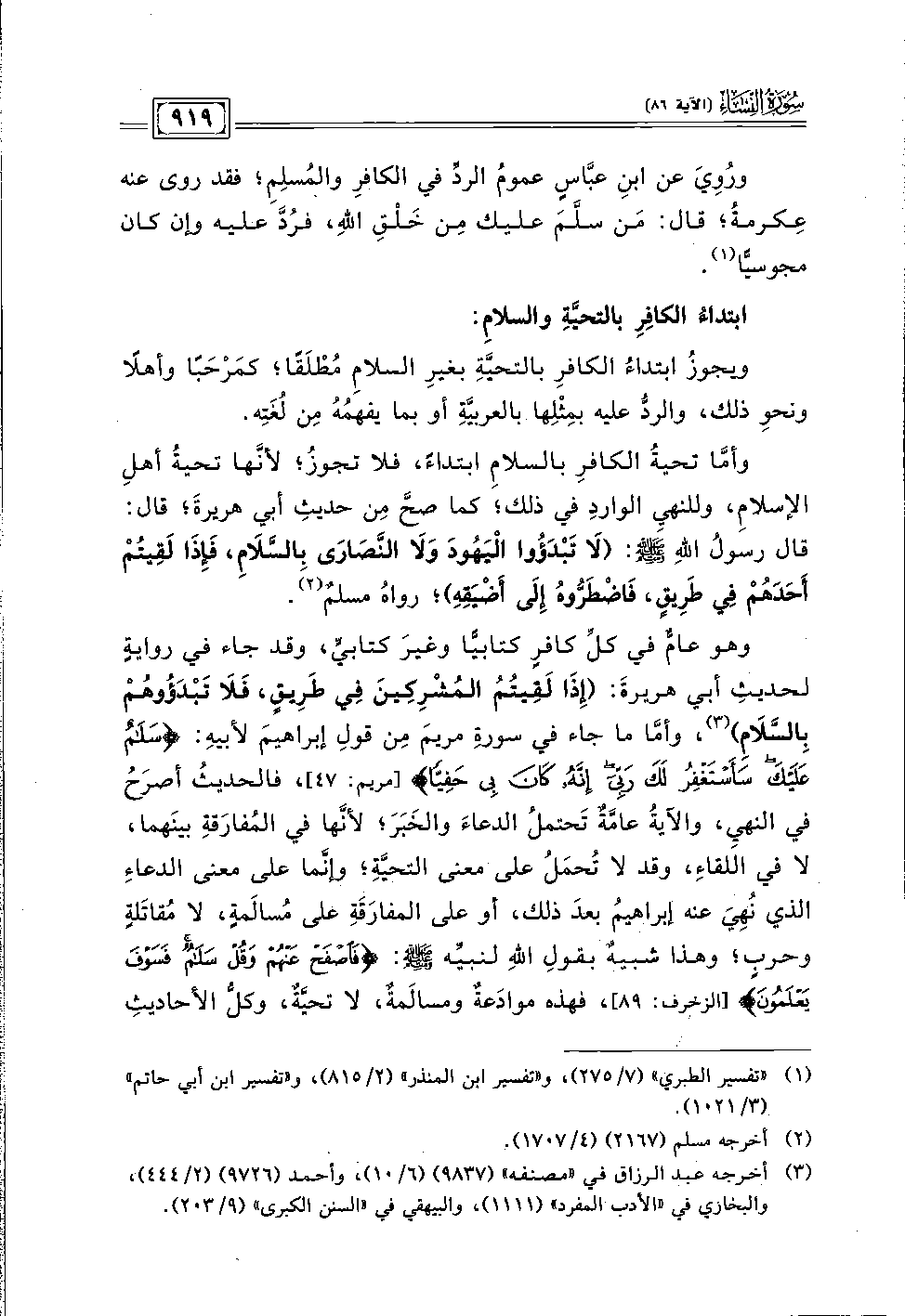 وهو عامٌّ في كلِّ كافرٍ كتابيًّا وغيرَ كتابيٍّ، وقد جاء في روايةٍ لحديثِ أبي هريرةَ: (إِذَا لَقِيتُمُ المُشْرِكِينَ فِي طَرِيقٍ، فَلَا تَبْدَؤُوهُمْ بِالسَّلَامِ) (٣)، وأما ما جاء في سورةِ مريمَ مِن قولِ إبراهيمَ لأبيهِ: {سَلَامٌ عَلَيْكَ سَأَسْتَغْفِرُ لَكَ رَبِّي إِنَّهُ كَانَ بِي حَفِيًّا} [مريم: ٤٧]، فالحديثُ أصرَحُ في النهي، والآيةُ عامَّةٌ تَحتملُ الدعاءَ والخَبَرَ؛ لأنَّها في المُفارَقةِ بينَهما، لا في اللقاءِ وقد لا تُحمَلُ على معنى التحيَّةِ؛ وإنَّما على معنى الدعاءِ الذي نُهِيَ عنه إبراهيمُ بعدَ ذلك، أو على المفارَقَةِ على مُسالَمةٍ، لا مُقاتَلةٍ وحربٍ؛ وهذا شبيهٌ بقولِ اللهِ لنبيِّه - صلى الله عليه وسلم -: {فَاصْفَحْ عَنْهُمْ وَقُلْ سَلَامٌ فَسَوْفَ يَعْلَمُونَ} [الزخرف: ٨٩]، فهذه موادَعةٌ ومسالَمةٌ، لا تحيَّةٌ، وكلُّ الأحاديثِ