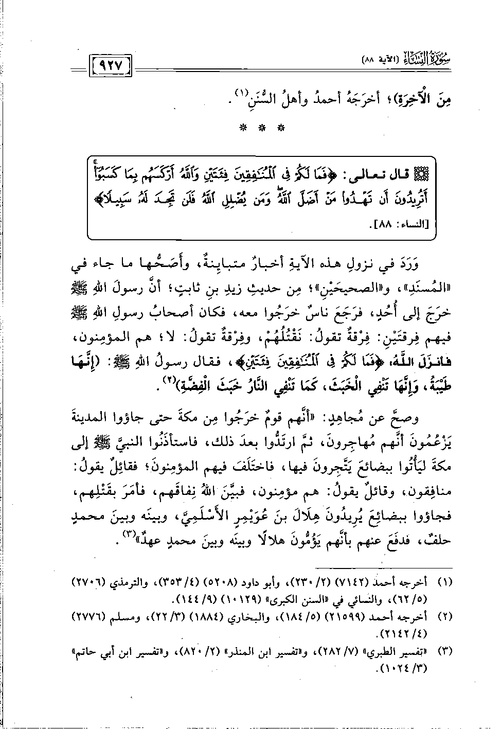 وَرَدَ في نزولِ هذه الآيةِ أخبارٌ متبايِنةٌ، وأصَحُّها ما جاء في "المْسنَدِ"، و"الصحيحَينِ"؛ مِن حديثِ زيدِ بنِ ثابتٍ؛ أنَّ رسولَ اللهِ - صلى الله عليه وسلم - خرَجَ إلى أُحُدٍ، فرَجَعَ ناسٌ خرَجُوا معه، فكان أصحابُ رسولِ اللهِ - صلى الله عليه وسلم - فيهم فِرقتَيْنِ: فِرْقةٌ تقولُ: نَقْتُلُهُمْ، وفِرْقةٌ تقولُ: لا؛ هم المؤمِنون، فأنزَلَ اللهُ: {فَمَا لَكُمْ فِي الْمُنَافِقِينَ فِئَتَيْنِ}، فقال رسولُ اللهِ - صلى الله عليه وسلم -: (إنَّهَا طَيْبَةُ، وَإِنَّهَا تَنْفِي الْخَبَثَ، كمَا تَنْفِي النَّارُ خَبَثَ الْفِضَّةِ) (٢).